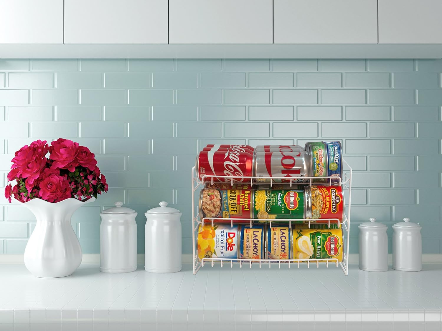 - Angled gravity fed system brings cans forward for easy access. The Original Canrack fits in most kitchen cabinets and pantry shelves. No more stacking cans and shuffling them to find the right one. The steel wire construction is designed for years of use, and it's easy to clean. If you only order one, you will be back for more.