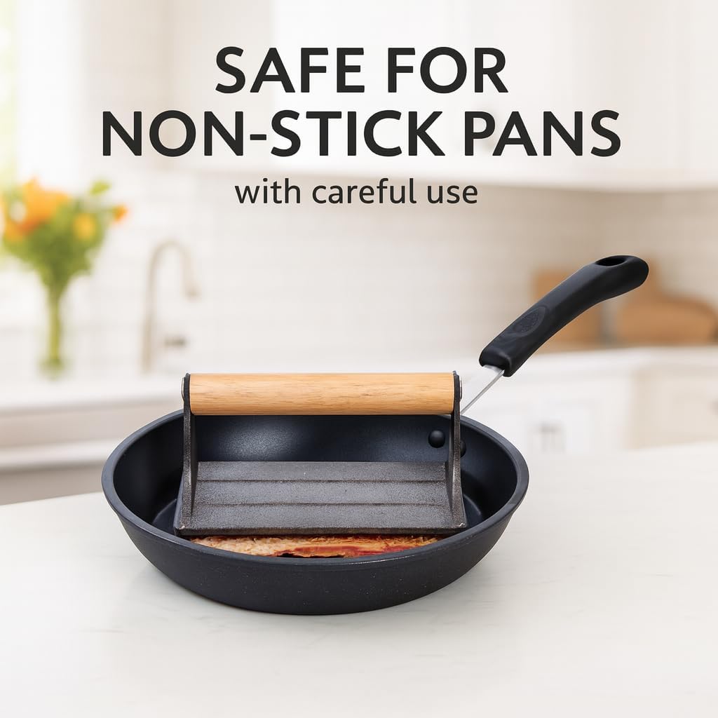 - Easy To Use: Preheat press on grill or griddle for optimal results; press foods gently to cook evenly and faster without splatter