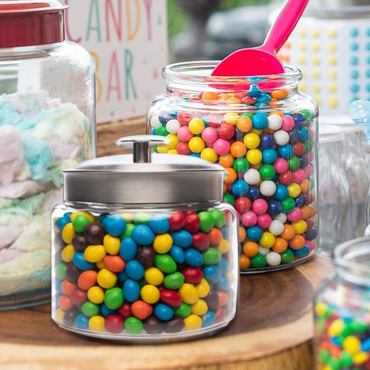 - USE: These glass jars are perfect to display all manner of dry goods including flour, rice, coffee, sugar, spices, and candy. But that’s not all. Make ideal cookie jars and cat and dog-treat containers.