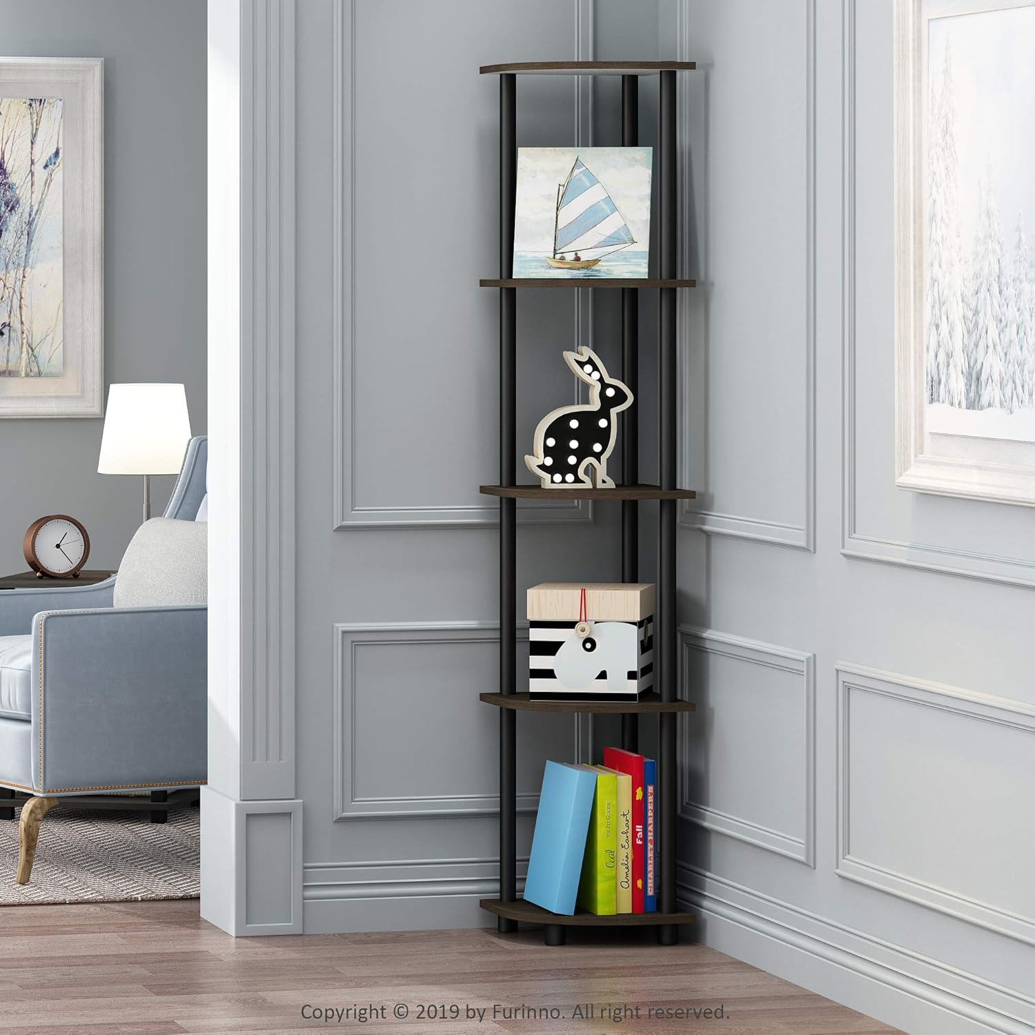 Furinno TURN-N-TUBE Corner Shelf Set of 2, 5-Tier Corner Bookshelf, Open Storage Shelves, for Organization and Storage, Living Room, Home Office, Garage, Dark Brown Grain