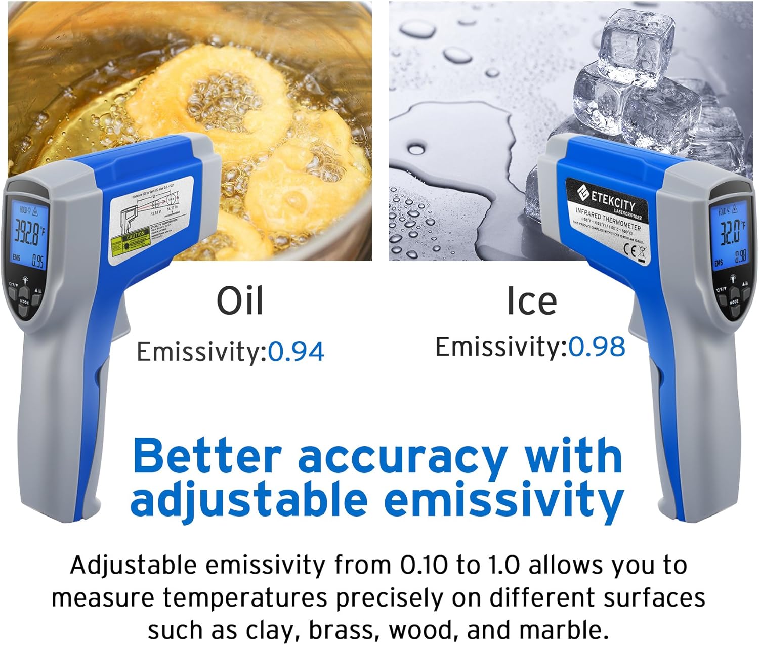 - ADJUSTABLE EMISSIVITY: Emissivity is the measure of an object's ability to emit infrared energy. Emitted energy indicates the temperature of the object. Adjustable emissivity improves measurement accuracy across different surface types, just regulate the emissivity of your 1022 according to the instruction(0. 1-1. 0)