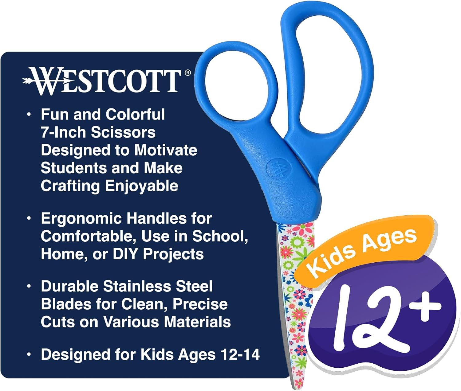 Westcott Fun and Fashionable Student Scissors for Ages 12+, Stainless Steel Floral-Printed Blades, Back-to-School, School Supplies, Classroom Supplies, 7-Inch