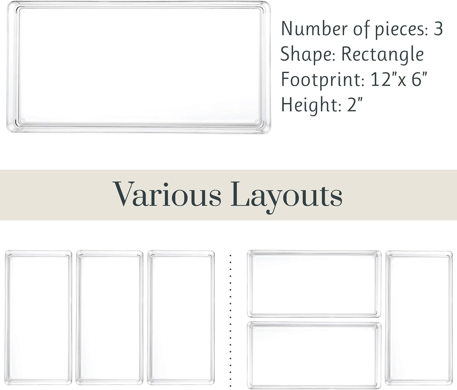 - This comprehensive set includes three meticulously crafted 12-inch by 6-inch shallow drawer organizers, designed to accommodate your essentials with precision. And with additional sizes available, you have the freedom to expand your organizational arsenal to tackle any cluttered drawer with finesse.