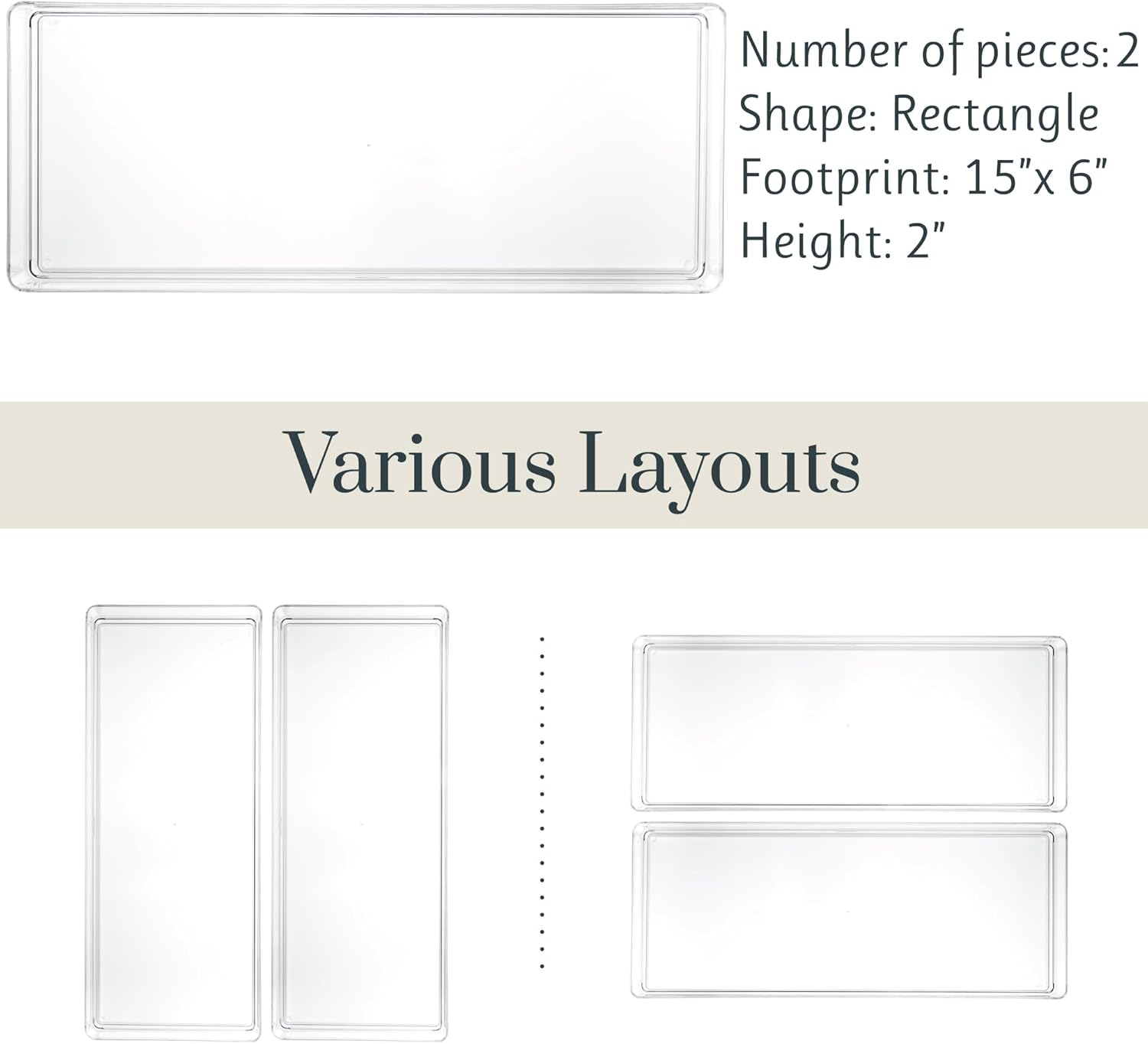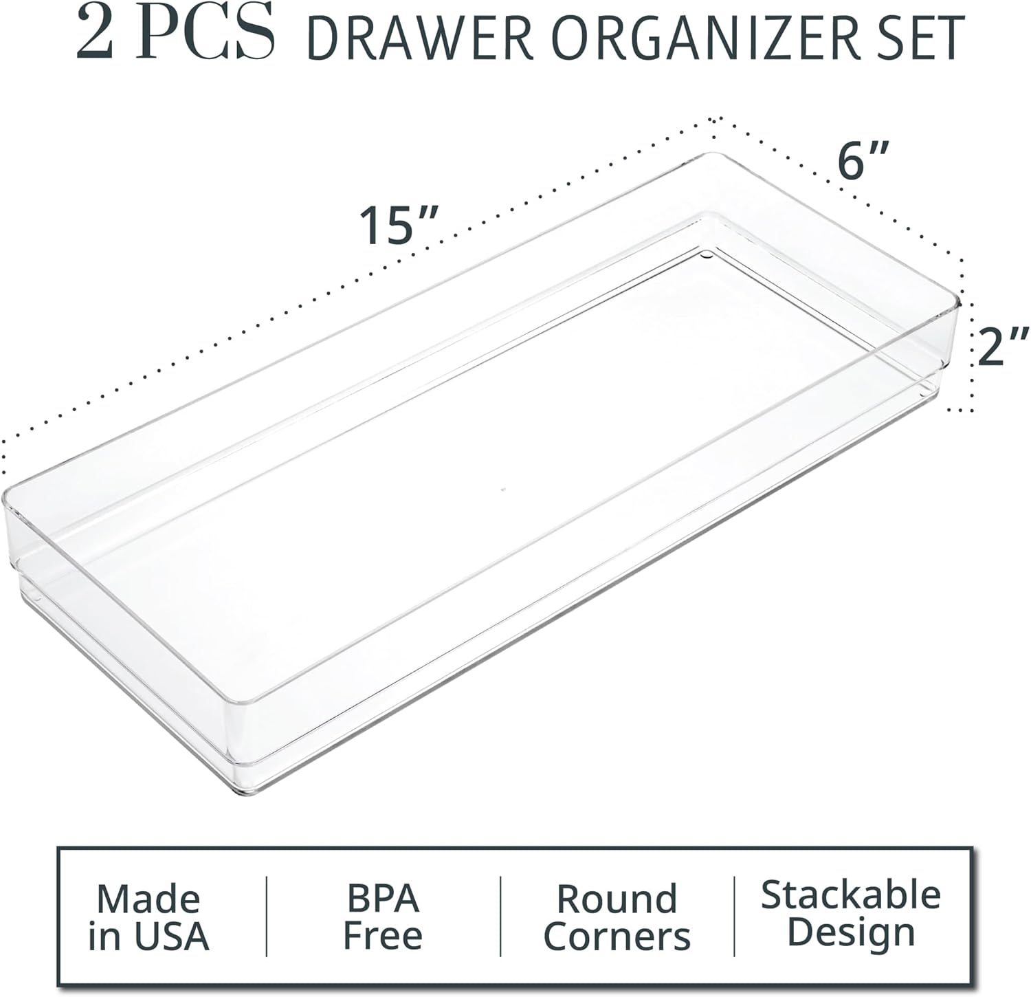 STORi SimpleSort 2-Piece Stackable Clear Drawer Organizer Set | 15" x 6" x 2" Rectangle Trays | Wide Makeup Vanity Storage Bins and Office Desk Drawer Dividers | Made in USA