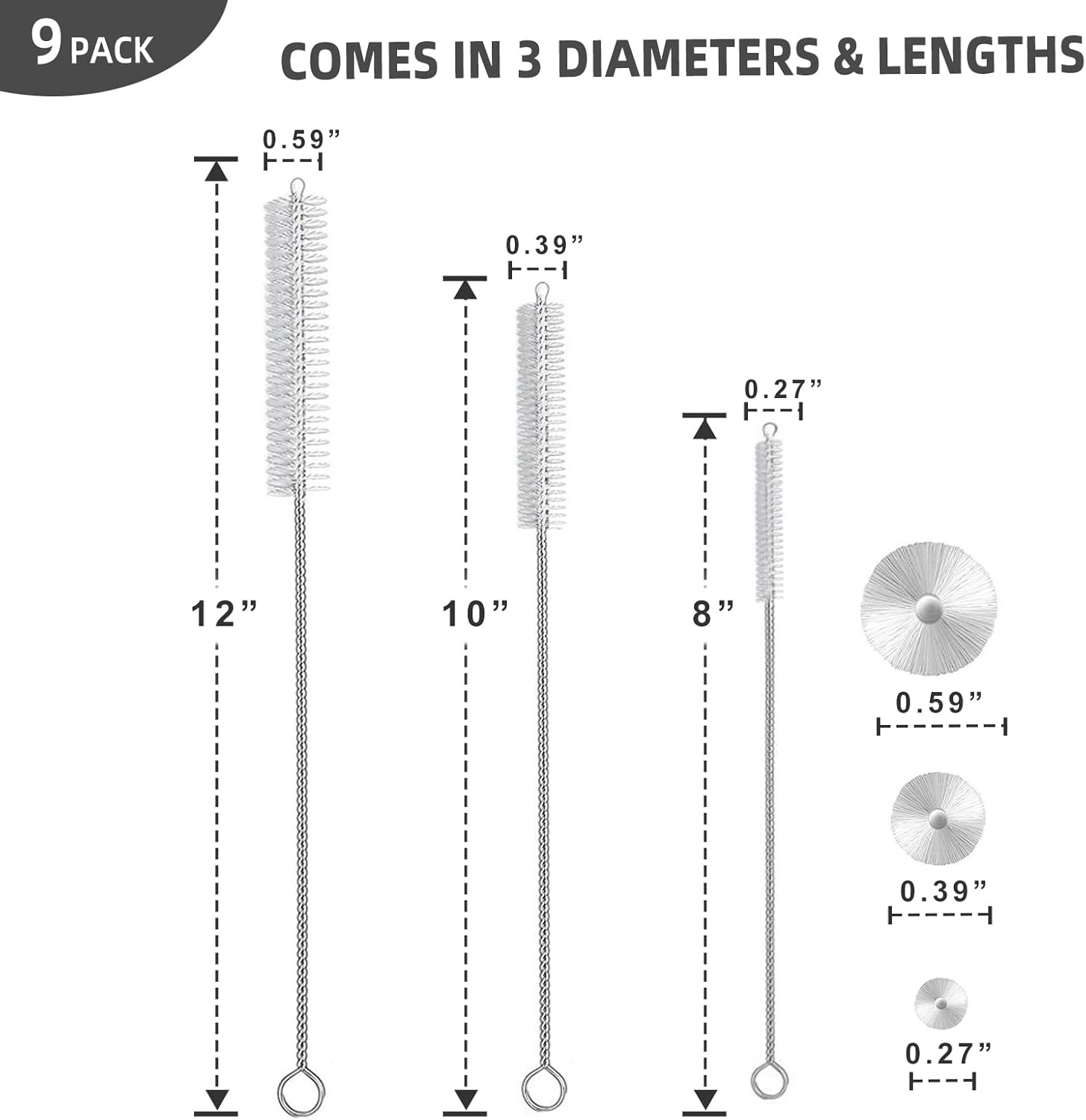 - MULTIPLE SIZE – With this set of 9 straws you will get a straw with a diameter of 6 mm, 9 mm and 12 mm, and nylon bristle length of 8 inches, 10 inches and 12 inches. Great for clean your straws on Tumbler, Sippy Cup, Baby Bottles, Tervis, CamelBak, Hydroflasks, Yeti, Starbucks Cup and others.