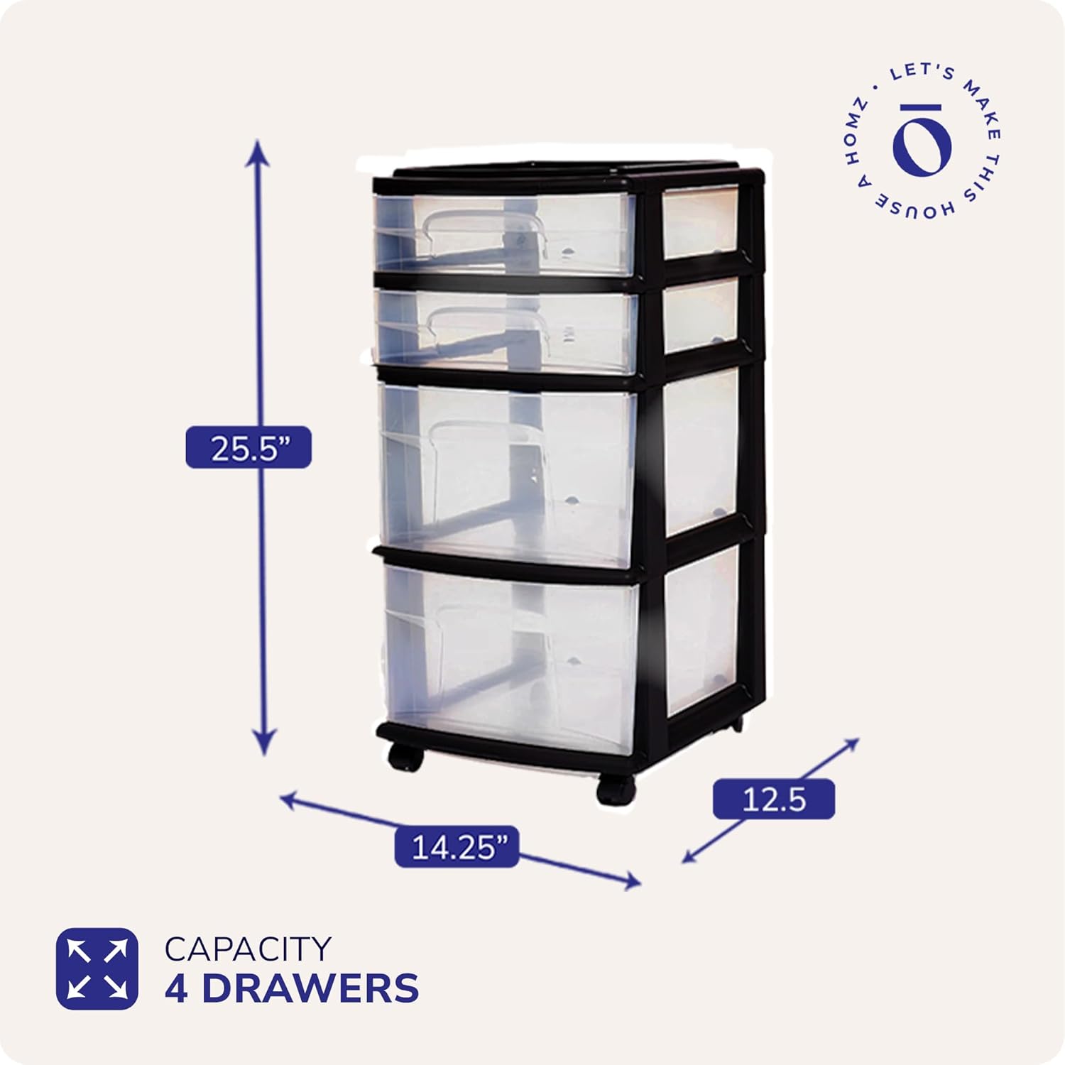 HOMZ Drawer Tower, 4-Tier Clear Plastic Storage Organizer Cart, Black Frame - Multi-Purpose Rolling Drawers with Wheels for Bedroom, Bathroom, and Office Organization