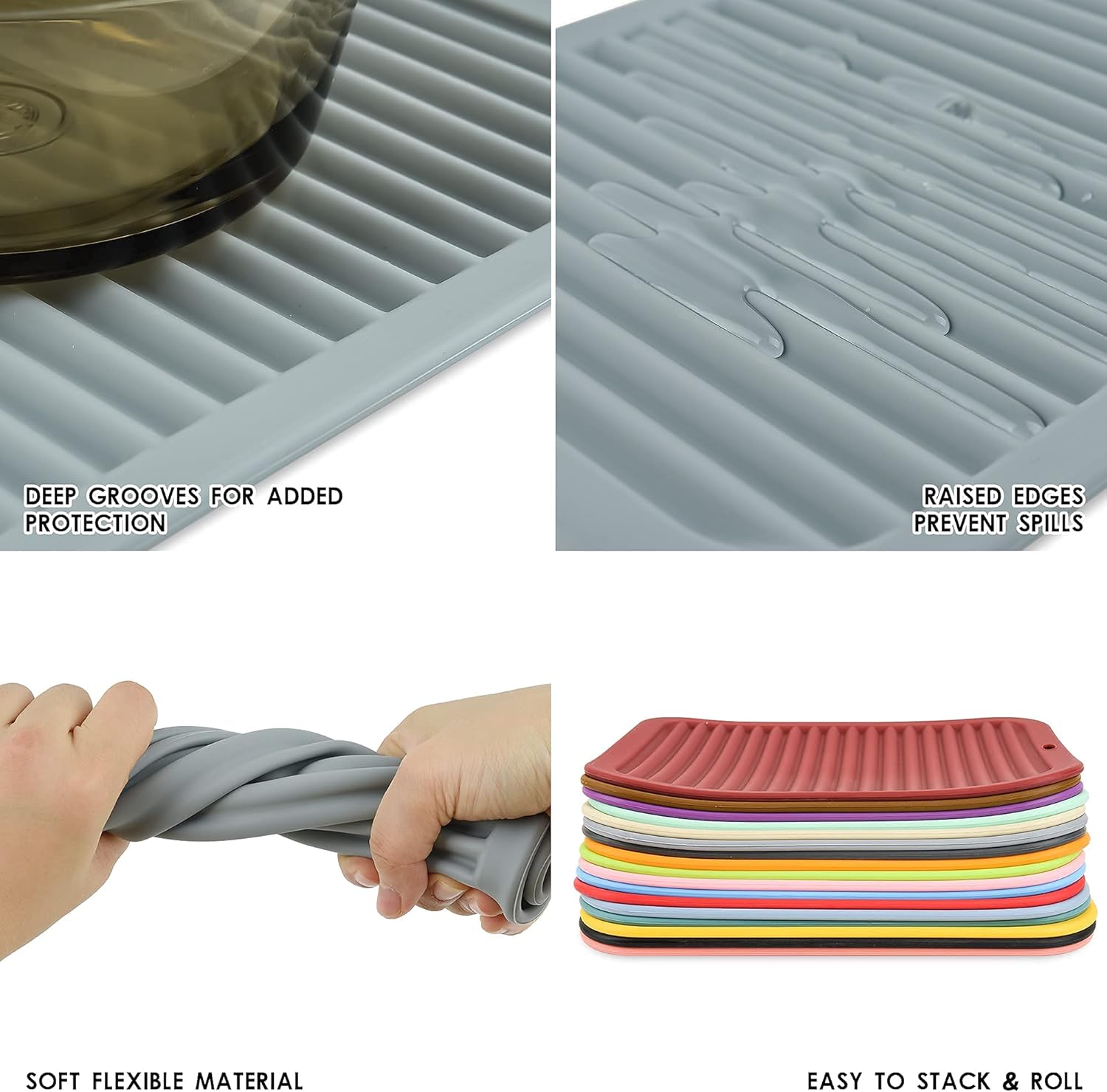 - EASY TO STORE & DURABLE - Roll up or hang on hook, simply hand-<br>wash and dishwasher safe,tested to withstand repeated twisting & <br>bending.Lifetime, no-hassle free-replacement guarantee.