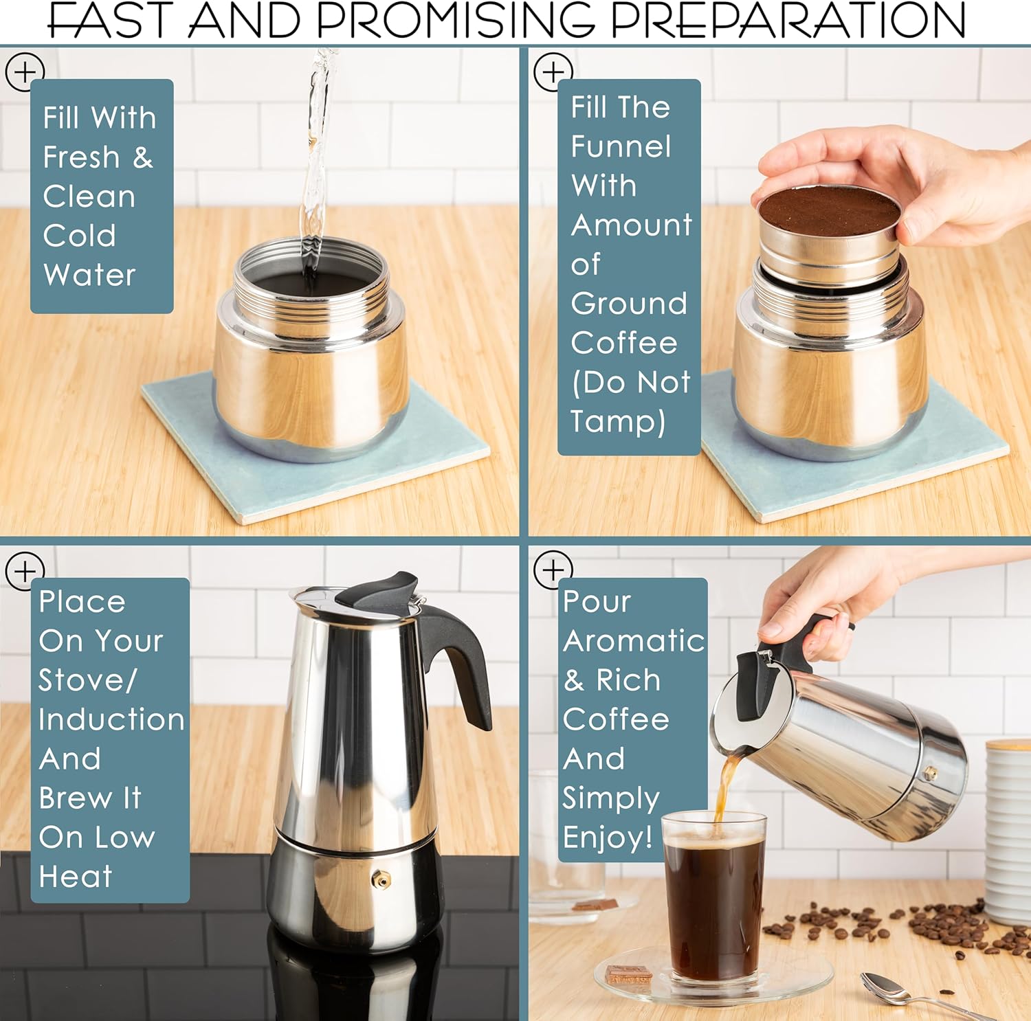 - Easy to Use Stovetop Espresso Maker: Fill lower chamber with water and ground coffee, heat on stovetop, to enjoy espresso in minutes. Wait 1 min after brewing before opening to avoid pressure-related spills