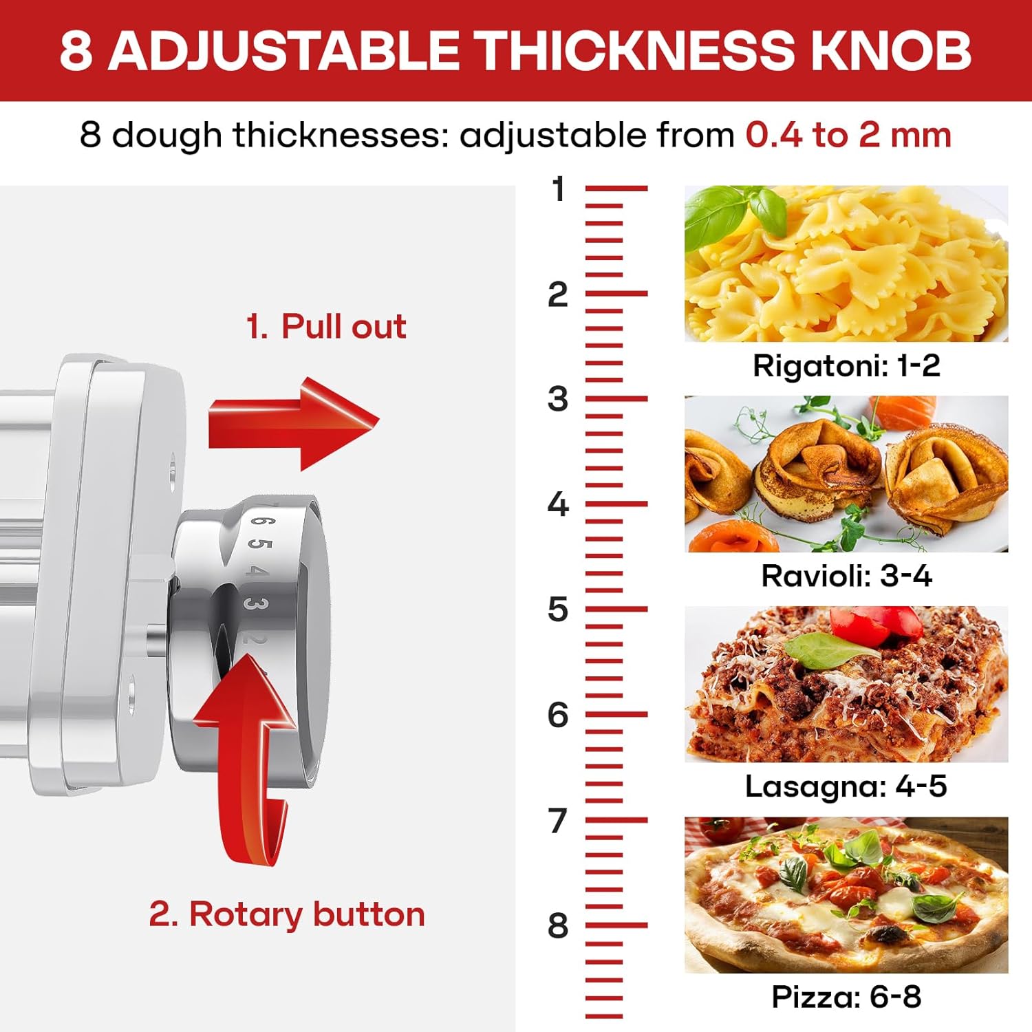- The GVODE pasta roller for KitchenAid features a regulating knob with 8 settings, letting you choose dough sheet thickness from 0.4 to 2 mm (0.016 to 0.08 in)—this simple adjustment changes the texture and taste of your pasta—and it produces uniformly thick pasta, perfect for wontons, dumplings, or taco flakes.