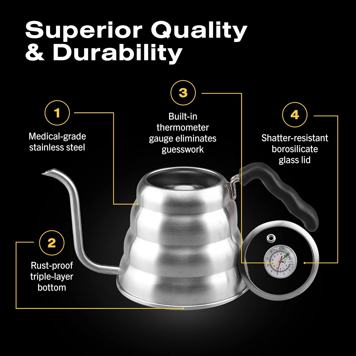 • TEMPERATURE CONTROL: Crafted with a Borosilicate glass top, built-in premium temperature gauge, and gooseneck spout, our coffee kettle eliminates guesswork - so you can enjoy every sip with a smile.
