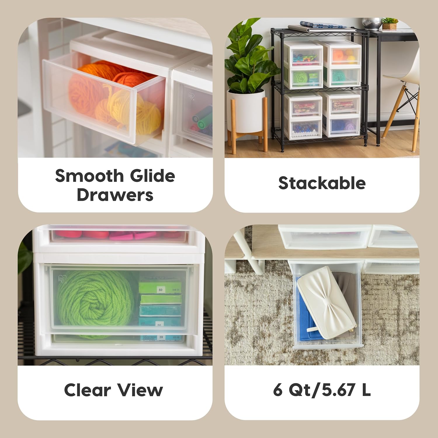 IRIS USA 6 Qt. Small Plastic Stacking Drawer, Stackable Storage Organizer Unit with Sliding Drawer for Bedroom Kitchen Under Sink Pantry Craft Room Dorm Office, White, 4-Pack