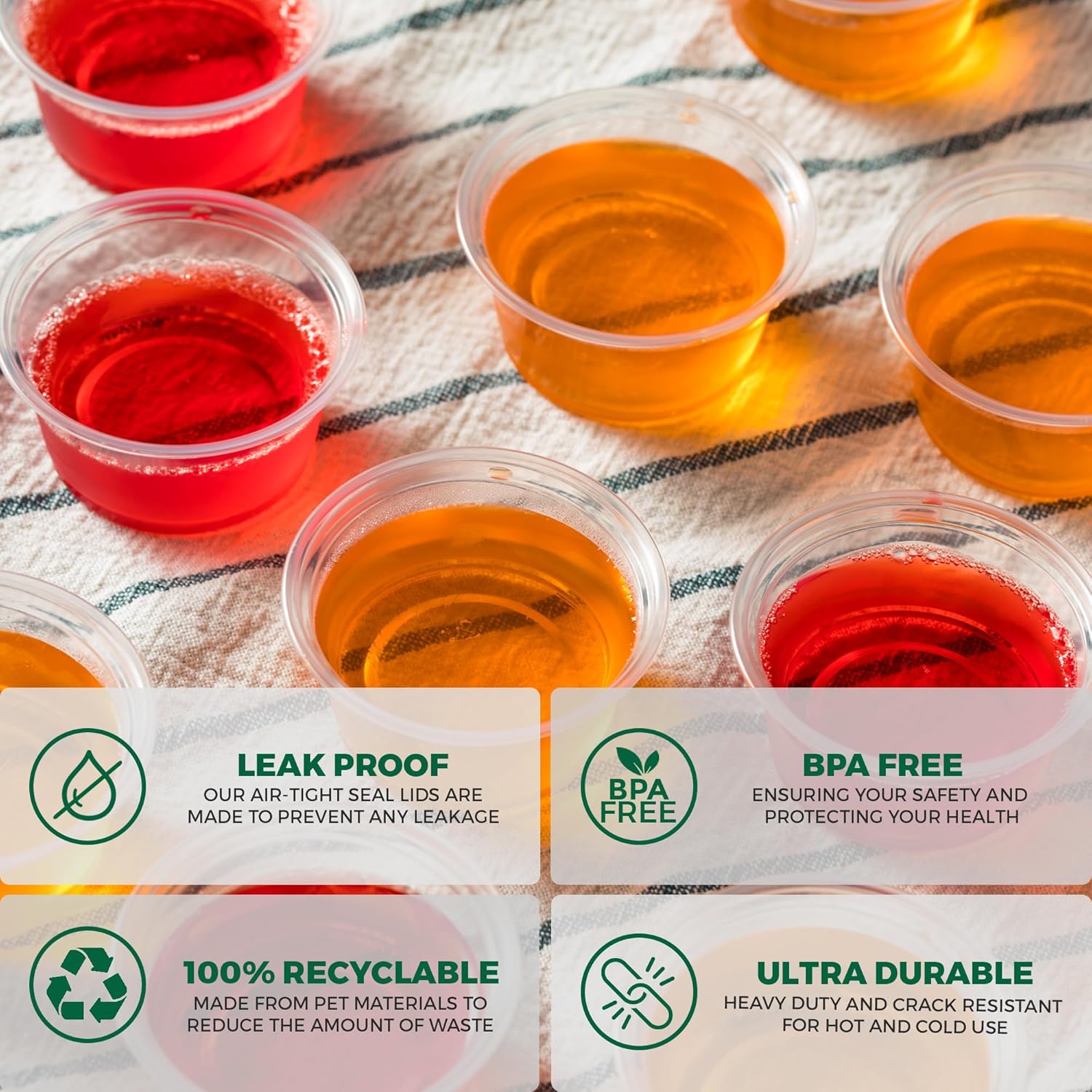 - ✅ Durable & Crack Resistant - Our jello cups made of food-grade, crystal clear, bpa-free, crack-resistant PP plastic, these lids are made of high quality PET plastic to ensures strength, flexibility and airtight.