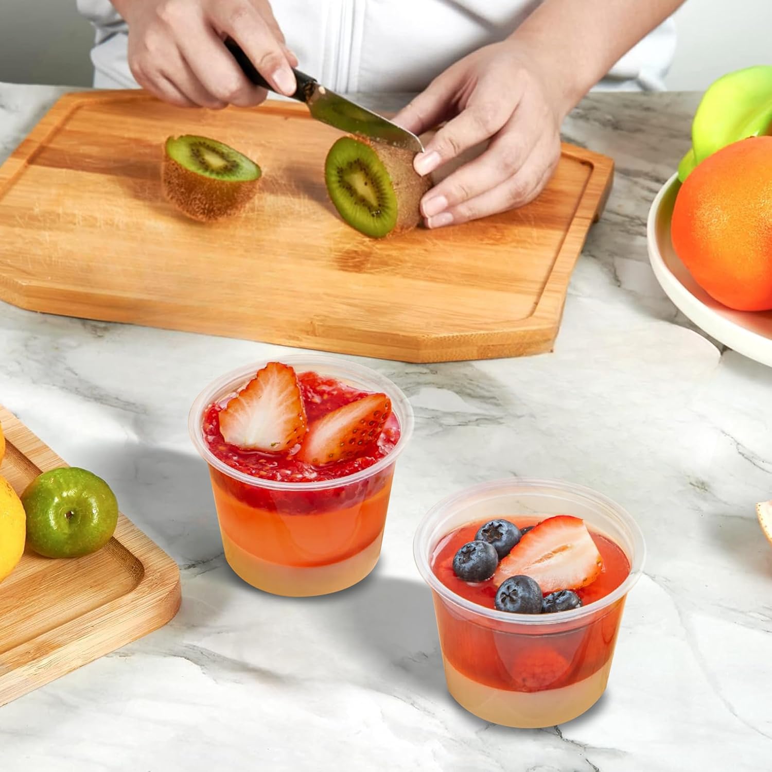 - Plastic jello shot cups, condiment cups, portion cups with lids made of durable crack-resistant polypropylene.