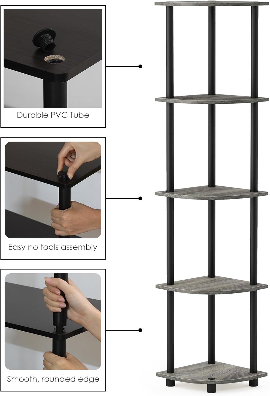 Furinno TURN-N-TUBE Corner Shelf Set of 2, 5-Tier Corner Bookshelf, Open Storage Shelves, for Organization and Storage, Living Room, Home Office, Garage, French Oak