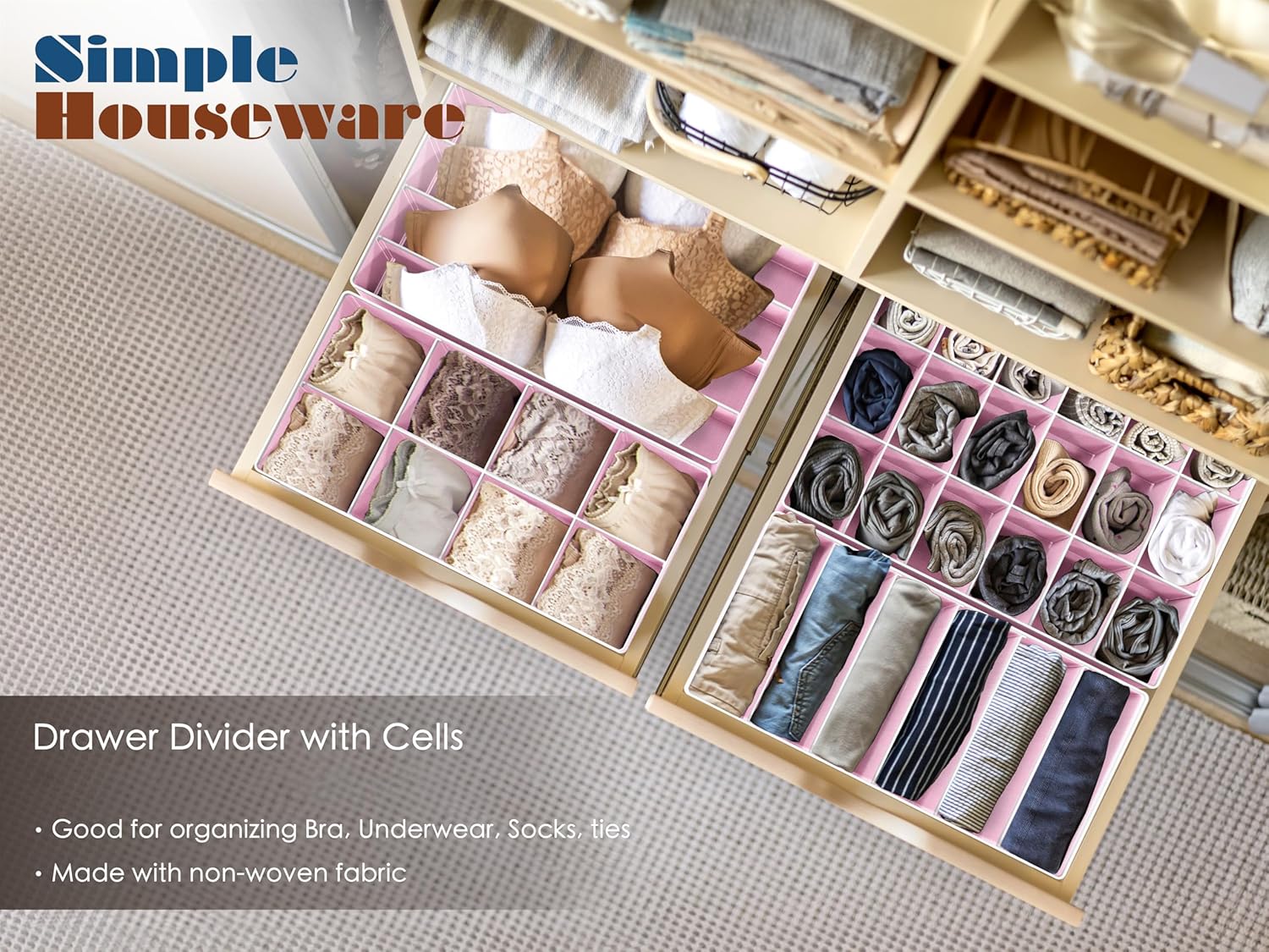 Simple Houseware 4-Pack Drawer Organizer Set - Closet Dividers for Underwear, Socks, Bras, Scarves, Ties - Foldable Non-Woven Storage Boxes, Pink