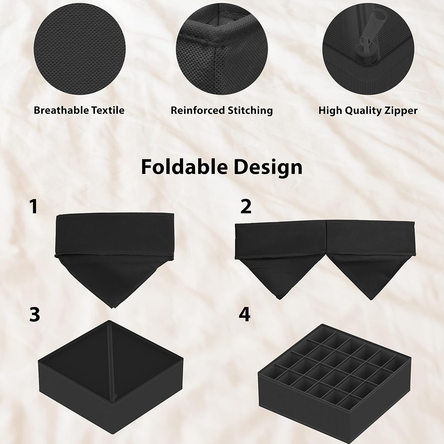 • 4 Versatile Organizers - Includes 6 cell(scarves, ties), 8 cell(underwear, briefs, ties), 7 cell(bra), 24 cell(socks) bins to neatly sort underwear, bras, socks, ties, and more