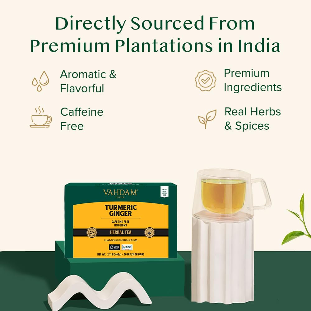 VAHDAM, Turmeric Ginger Herbal Tea Bags (30 Pyramid Tea Bags) Caffeine Free, Non GMO, Gluten Free | 100% Pure Herbal Blend - Savory & Spicy | Individually Wrapped Pyramid Tea Bags | Direct from Source