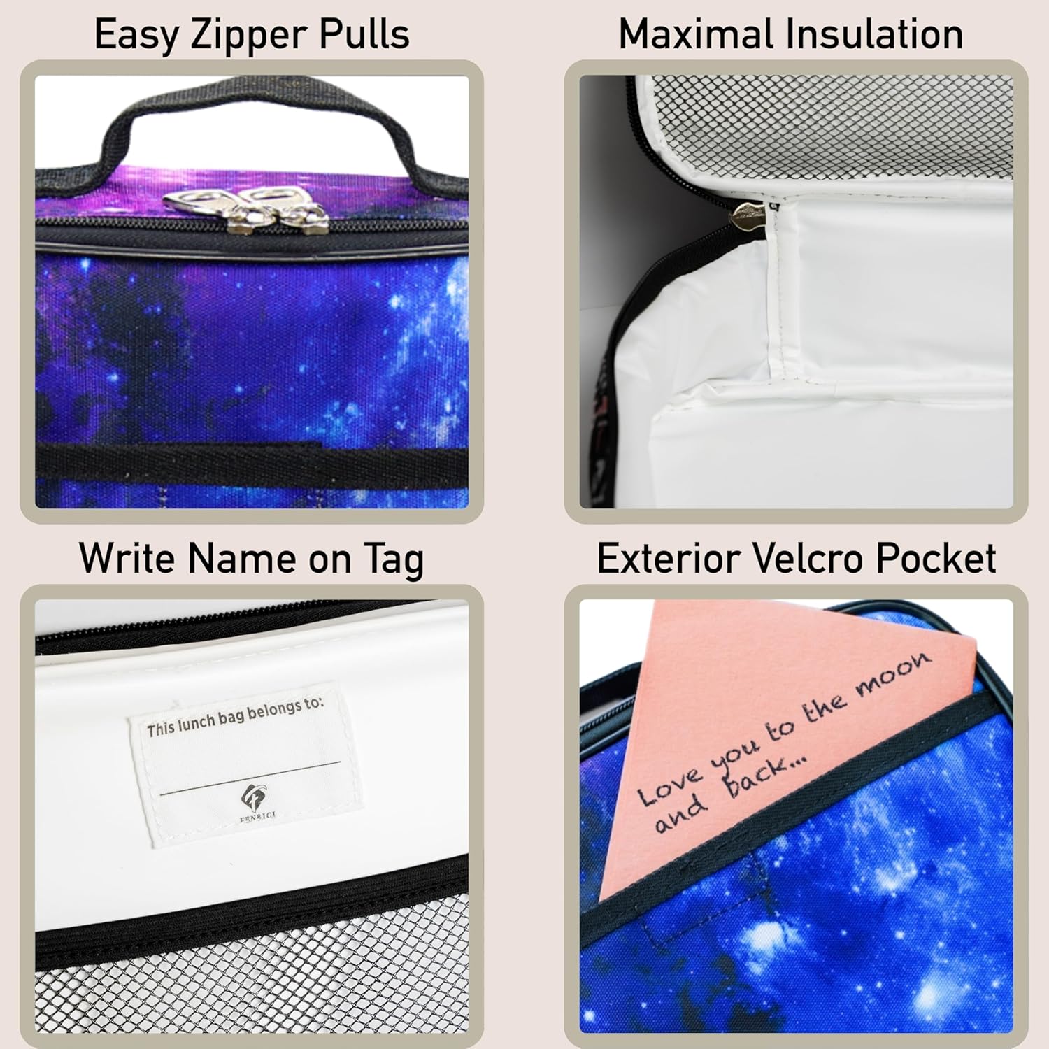 - MATCHING LUNCH BOX THAT IS TESTED TO BE FOOD SAFE: The Fenrici insulated Galaxy Lunch Box is made of advanced, non-toxic PEVA, an environmentally friendly, food-safe vinyl that’s made without chlorine or plasticizers. It is PVC free, Phthalate free, BPA free, and lead free.