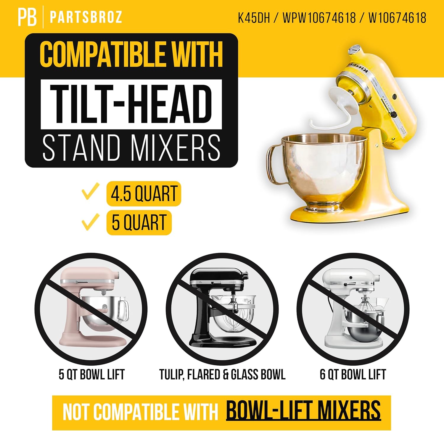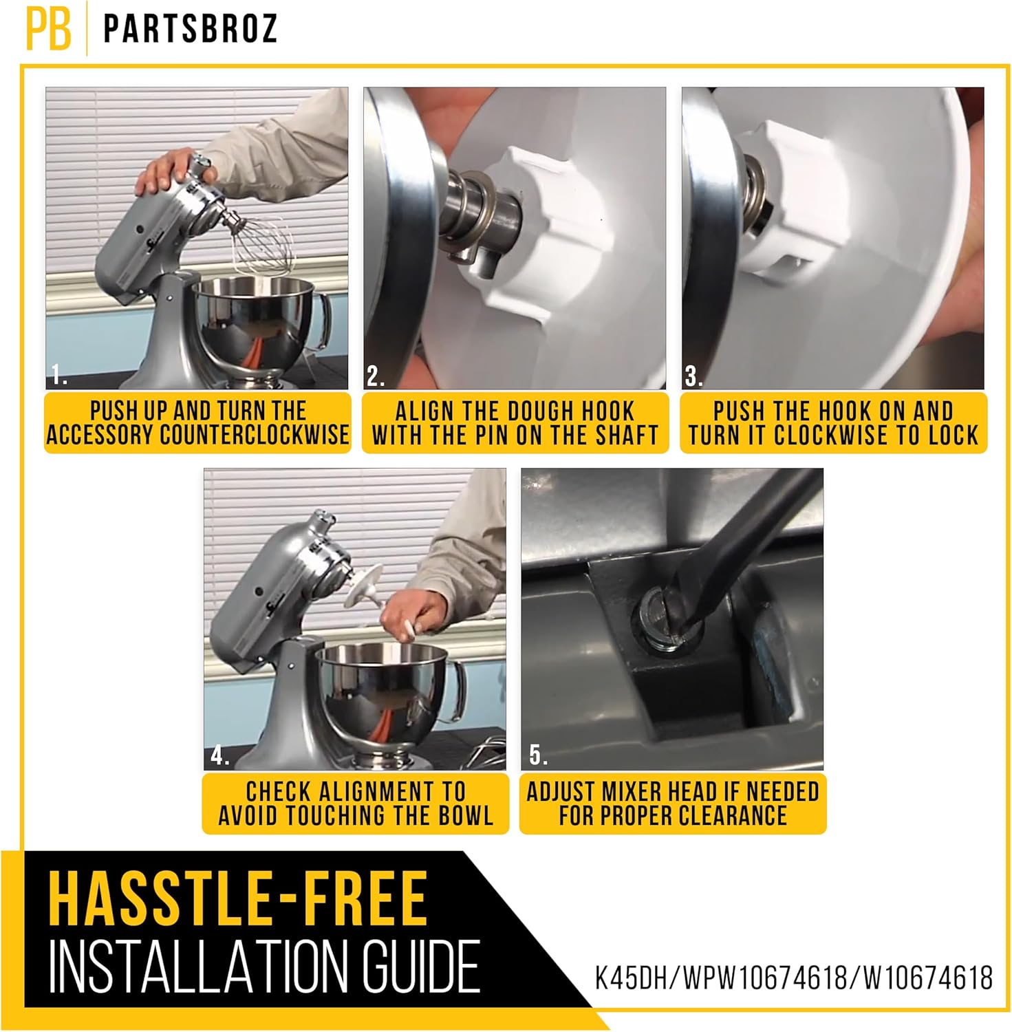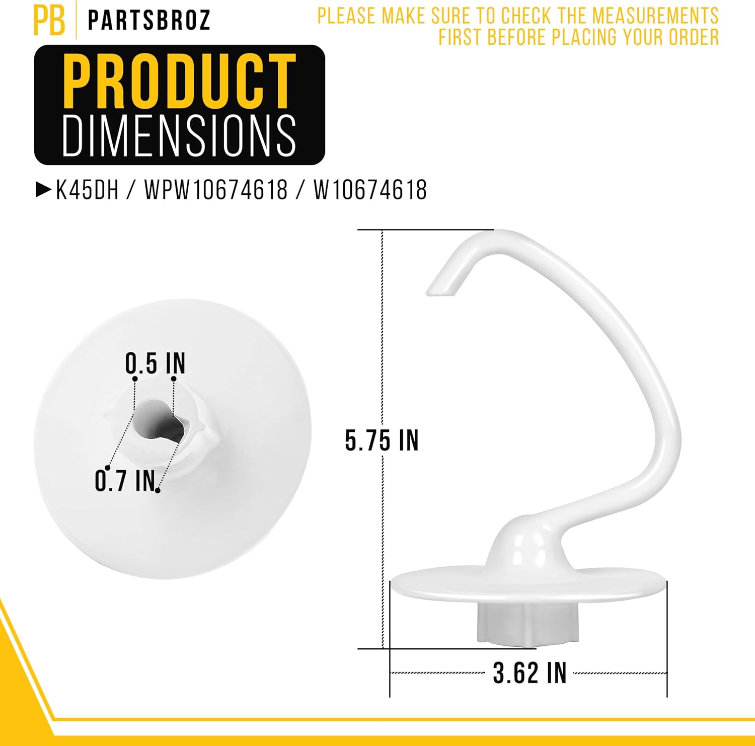 PartsBroz Kitchen Aid Dough Hook Attachment for Stand Mixer 4.5 Qt, 5 Qt for KitchenAid Dough Hook Attachment K45DH for Artisan Bread Kneading Model K45 KSM150 K45SS KSM95 KSM96 KSM90 KSM150PS K45SSWH