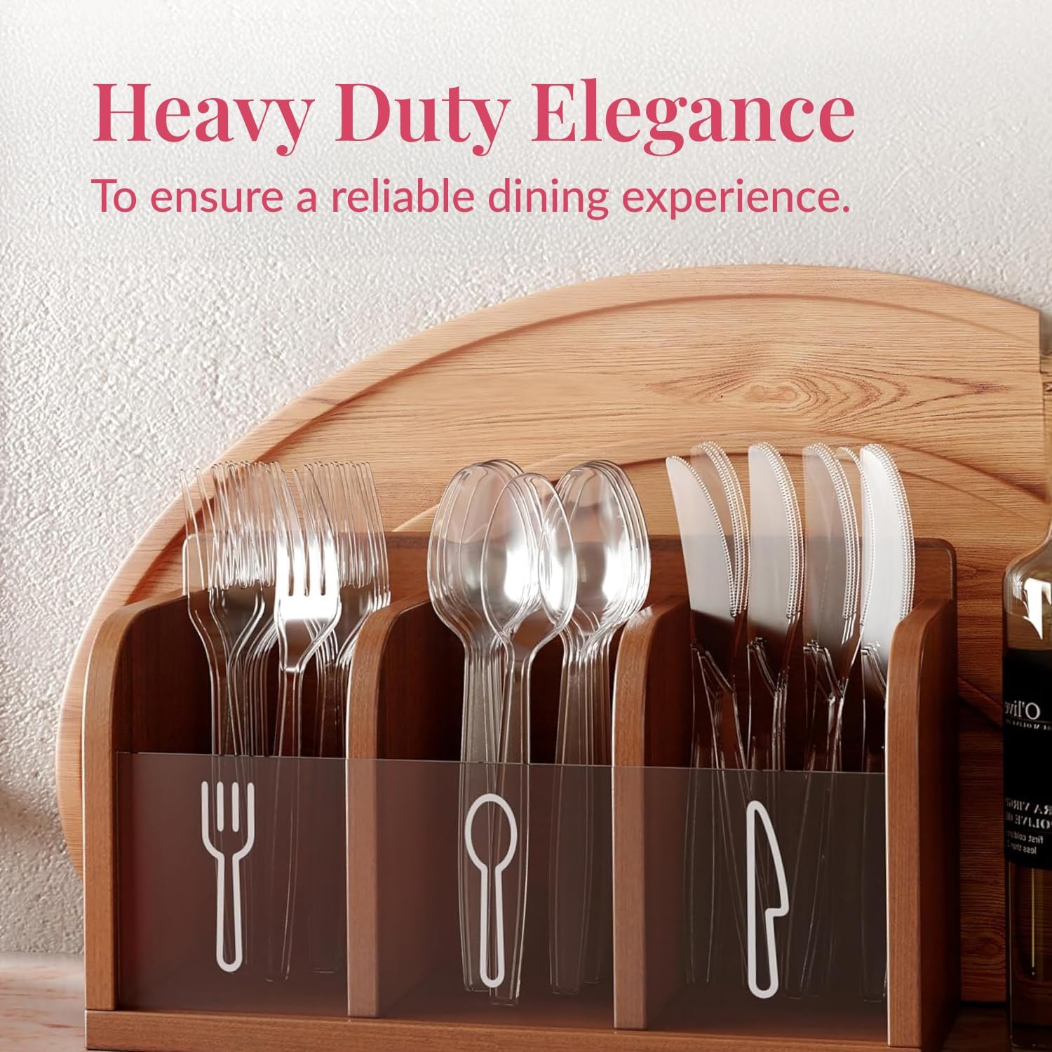 - Elegant Table Appearance: The clear finish offers an upscale, polished look; these heavy duty plastic silverware pieces bring chic style and function to banquets or formal celebrations