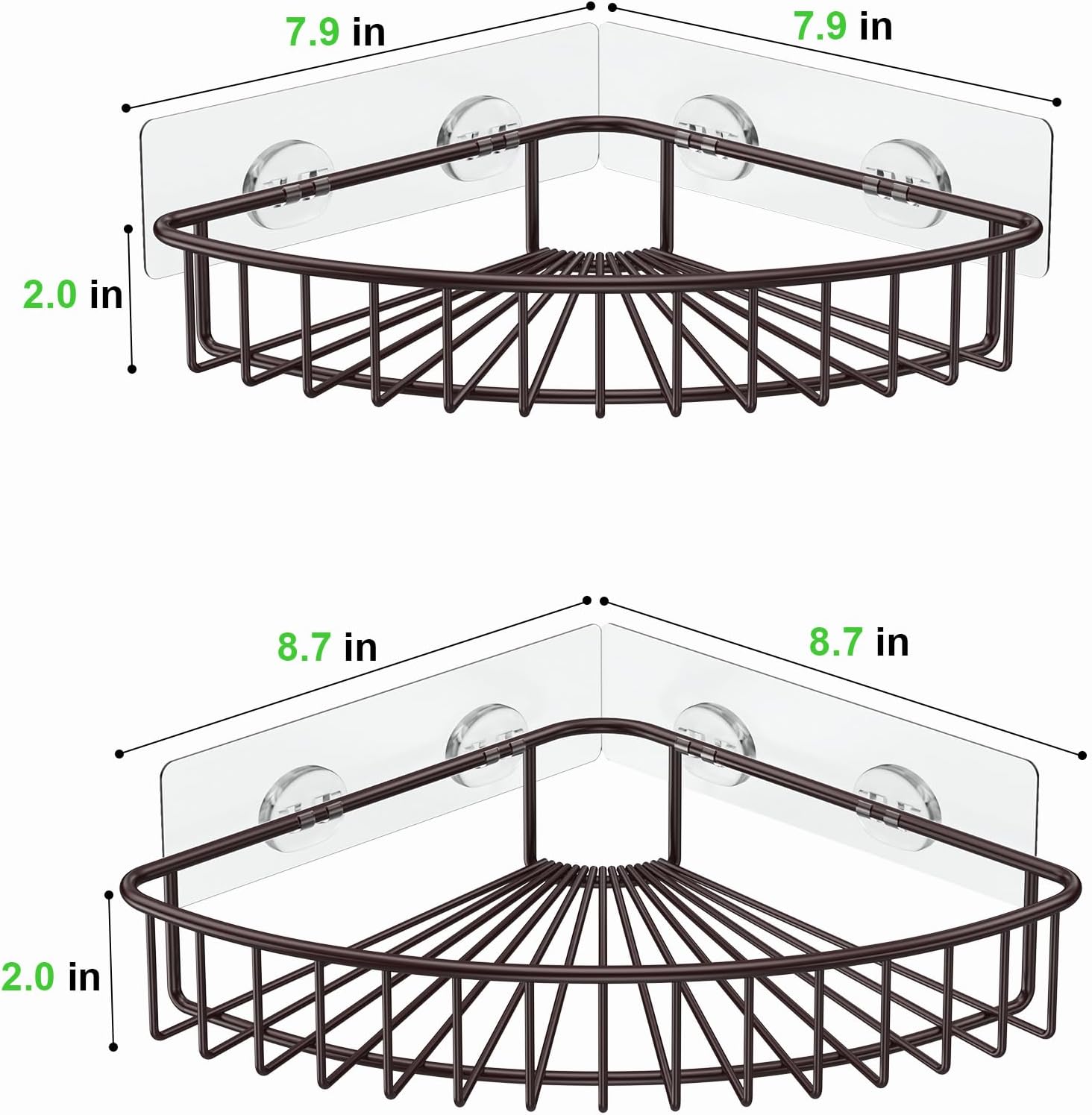 - 2 DIFFERENT SIZES: You will get 2 × shower caddies (large: 8.7 × 8.7 × 2.0 inches, small: 7.9 × 7.9 × 2.0 inches), 8 × adhesives. It is recommended to install the large layer first and put the objects you want to place on it, then install the small layer, to avoid the objects you want to put in after the installation is higher than the distance between the two layers.