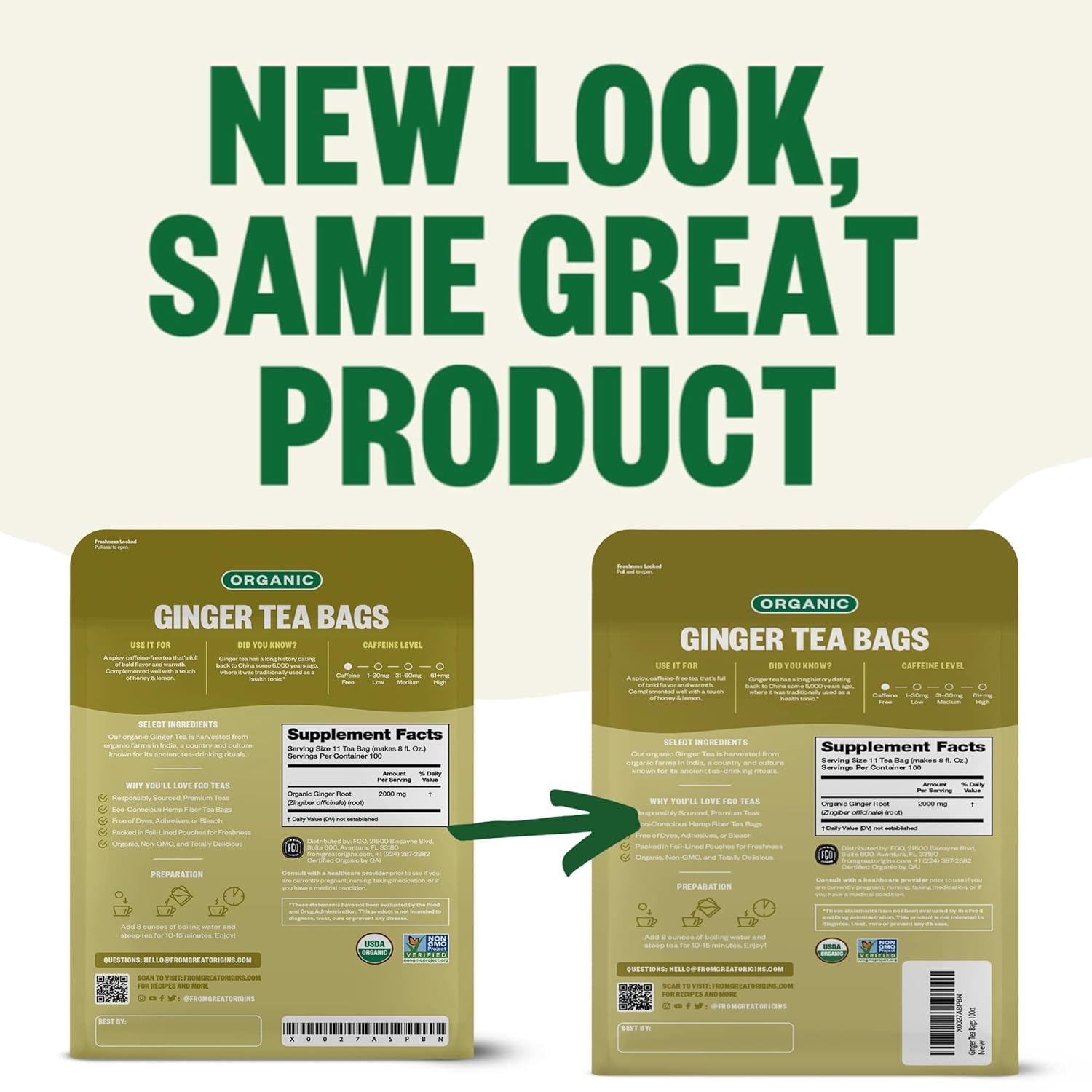 FGO Organic Ginger Tea, 100 Count, Eco-Conscious Tea Bags, Caffeine Free, Packaging May Vary (Pack of 1)