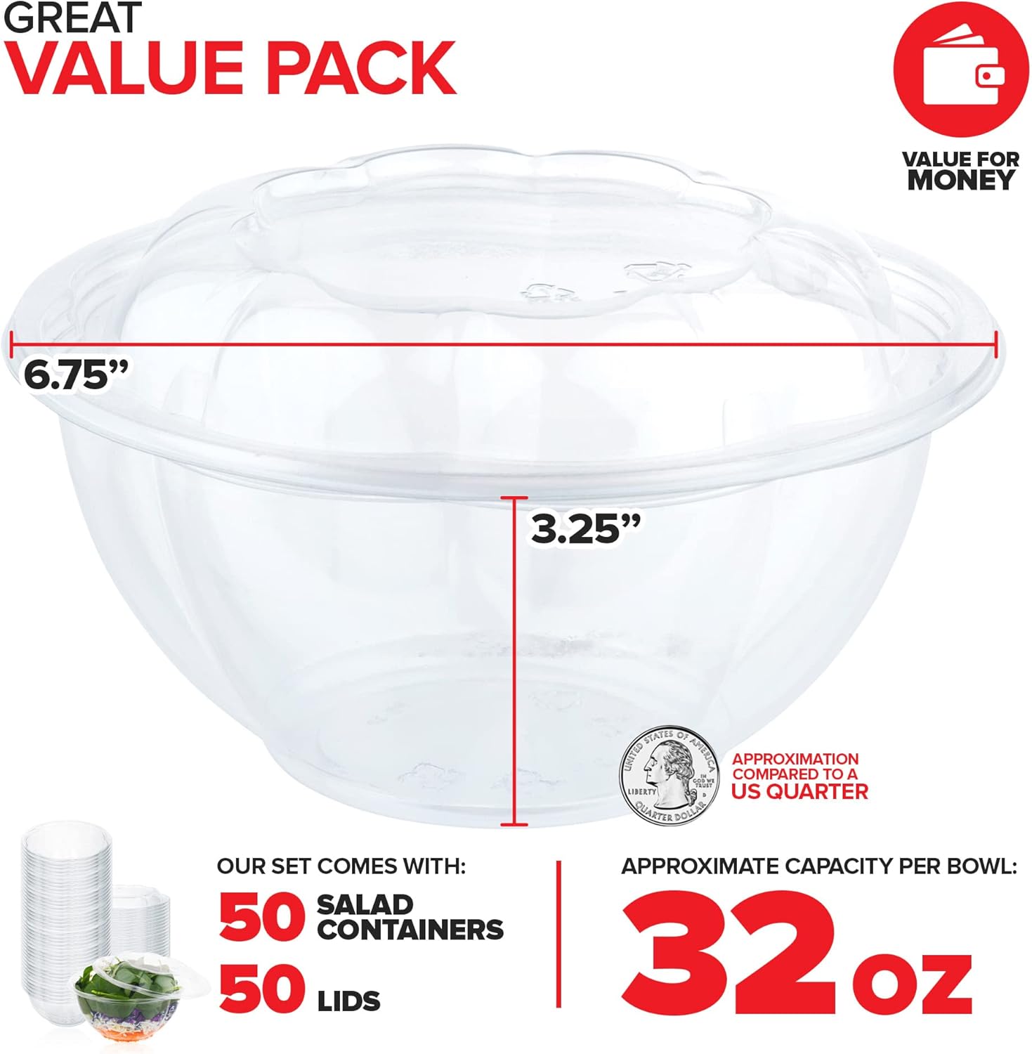 • Great Value Pack: Comes with 50 salad containers and 50 lids. Each container has a 32-ounce capacity. Measures approximately 6.75” Top Diameter x 3.25” Height.