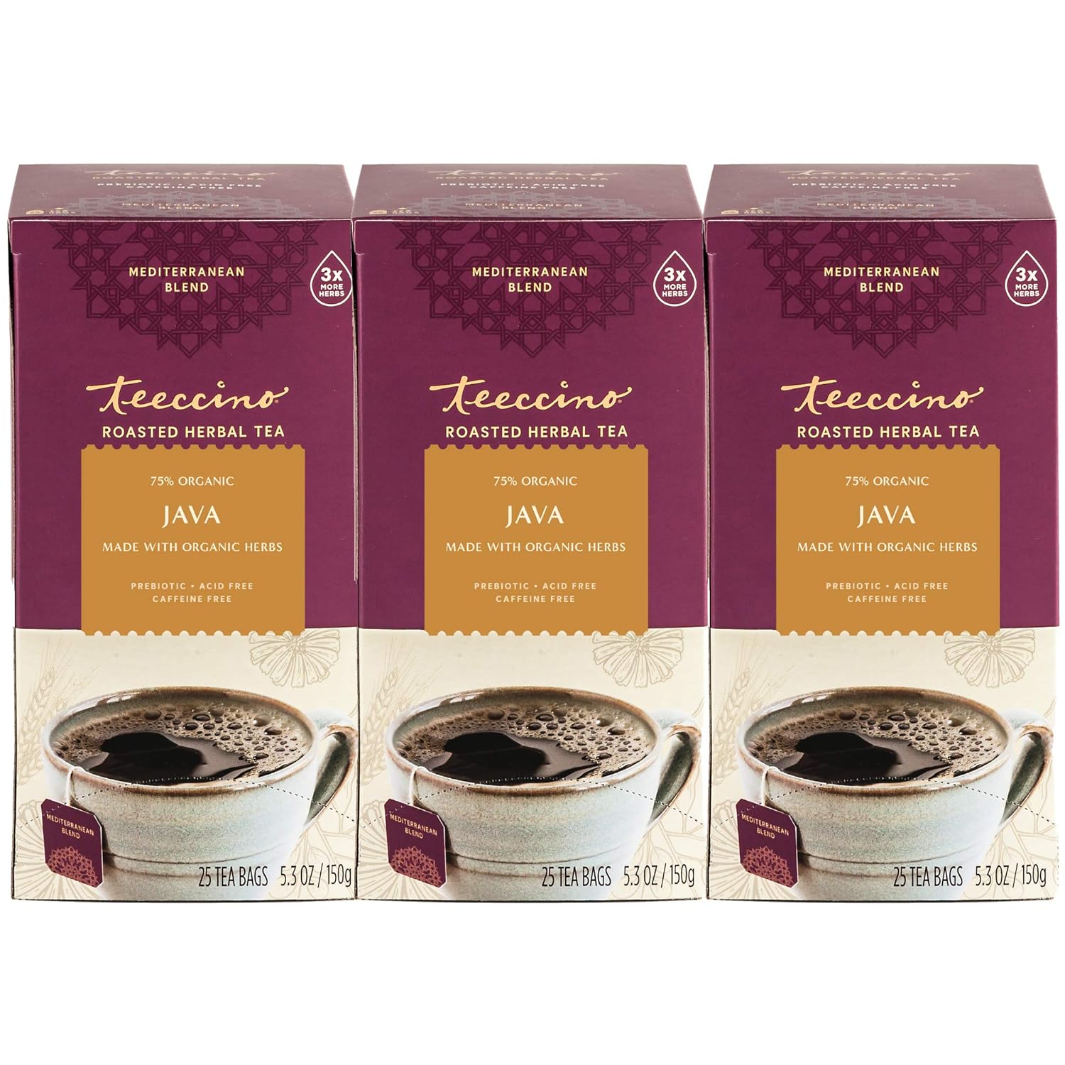 Teeccino Java Herbal Tea - Rich & Roasted Herbal Tea That’s Caffeine Free & Prebiotic for Natural Energy, 25 Tea Bags (Pack of 3)