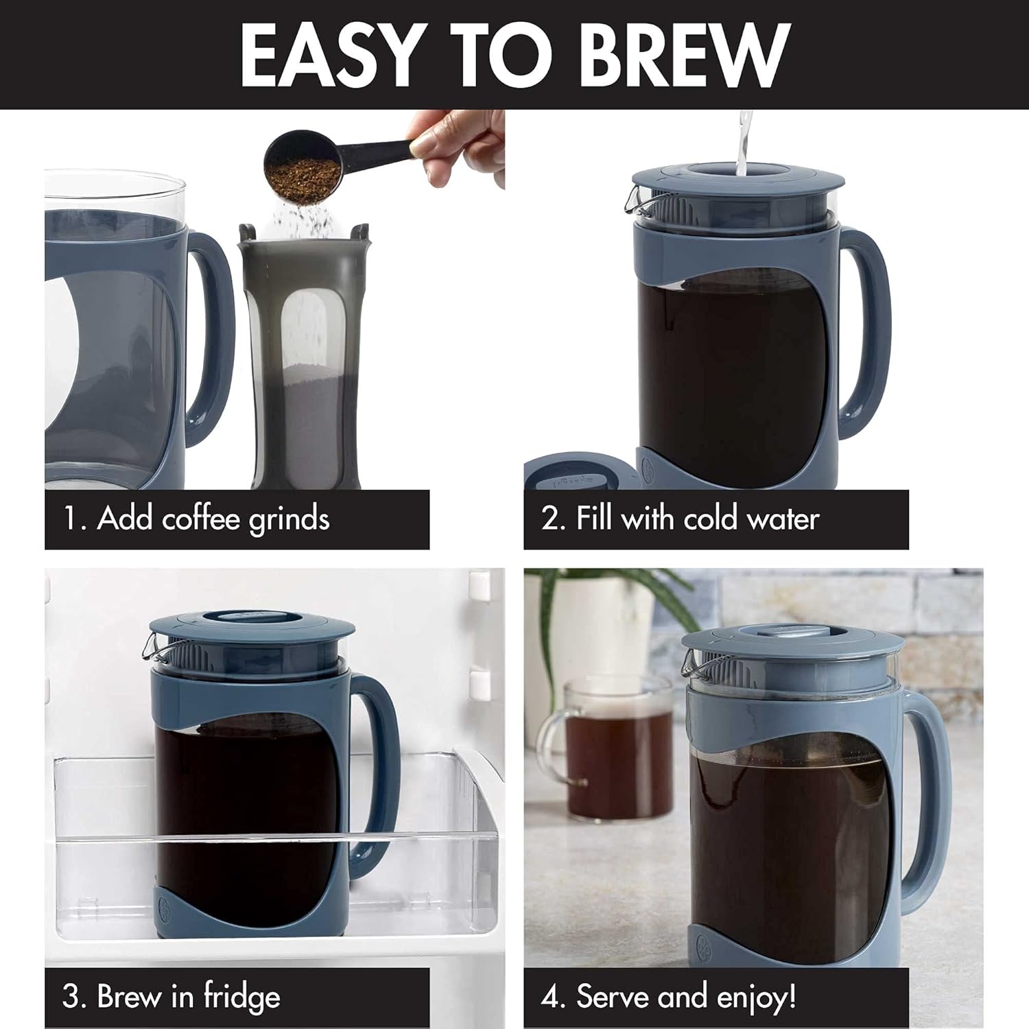 - STREAMLINED DESIGN – Simply add coffee grounds to the brew filter, pour cold water over the coffee, and let brew overnight or to desired strength. Serve cold, over ice or hot. Add milk, creamer, syrups or flavorings to fit your taste preferences, or add ice for an extra refreshing cup of coffee.
