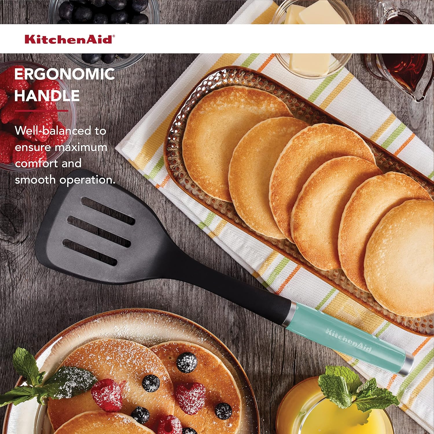 • ERGONOMIC DESIGN: The nylon fiberglass reinforced head provides support for the best performance in the kitchen. The glossy ABS handle features a debossed logo, as well as an ABS satin chrome plated bolster and endcap.