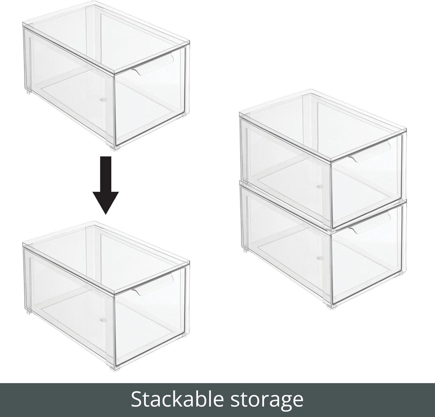 - STACKABLE: The pull-out drawer opens easily, making it simple to grab what you need quickly; The bin's clear construction lets you see what's inside, so you can easily find what you are looking for; The stackable design lets you maximize space by creating vertical storage; Use individually or together to create a custom storage system that works for you; Keep closet items contained, organized, and dust-free; mDESIGN TIP: Stack them vertically to maximize your storage potential - Stack and Store!