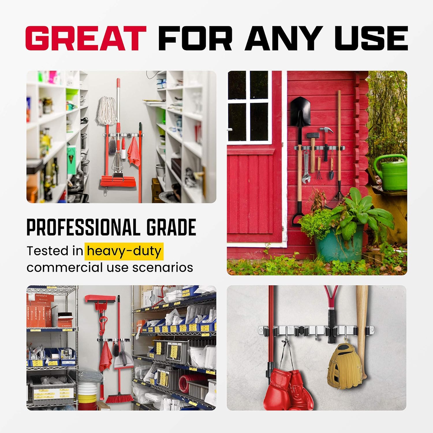 - WHEN HEAVY DUTY CALLS – Store your tools and supplies with confidence! This mop rack holds up to 40 lbs. when the screws are added on any surface.