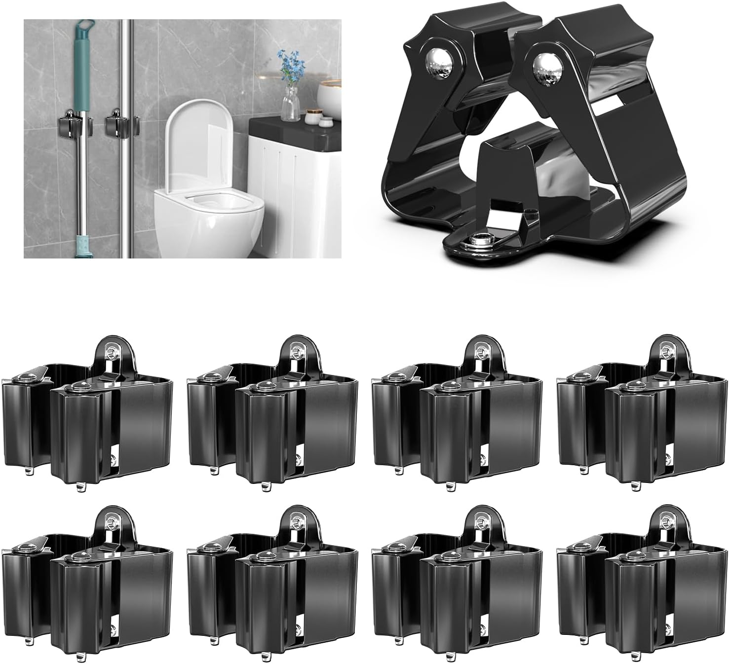 3-H Broom Holder Wall Mount 8 Pack, Mop and Broom Holder for Garage Garden Shed Storage System Laundry Room Home Kitchen Organization (Black)