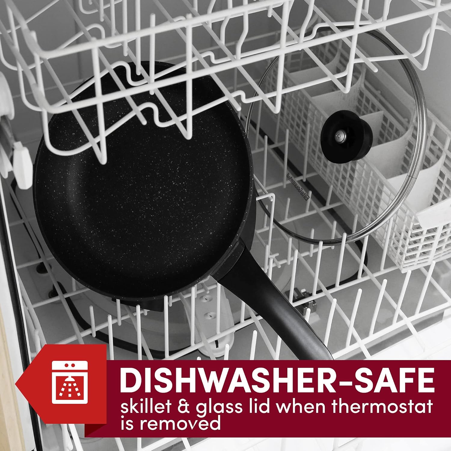 - DISHWASHER SAFE and fully immersible in your sink for fast, easy clean-up upon removal of the temperature control unit. Thick cast aluminum body with Black lacquer finish resists rusting or warping for added resilience.