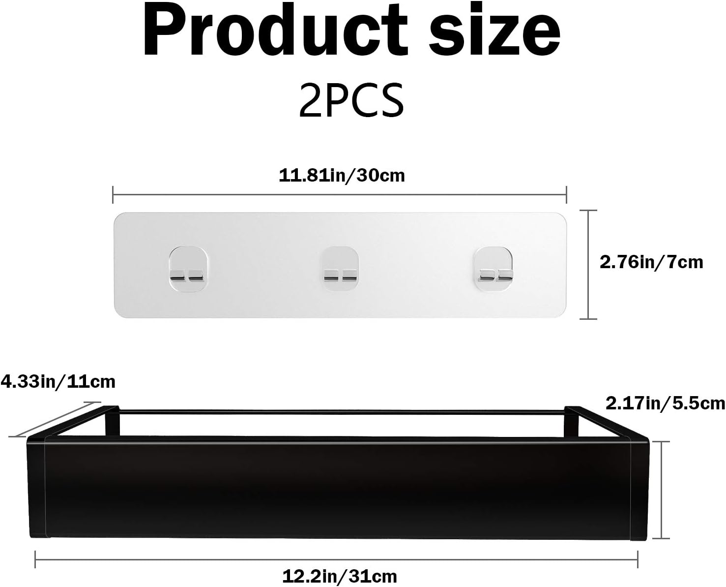 - 【Package Include】12.2 x 4.3 x 2.2 inches shelf with a detachable front plate, 2 versatile caddies, and 4 removable hooks for razors, towels, sponges, washing clothes, etc. Contact us if you need more strong adhesives to remove the caddy to other places, or search the ASIN: B097Y57BLL to find it