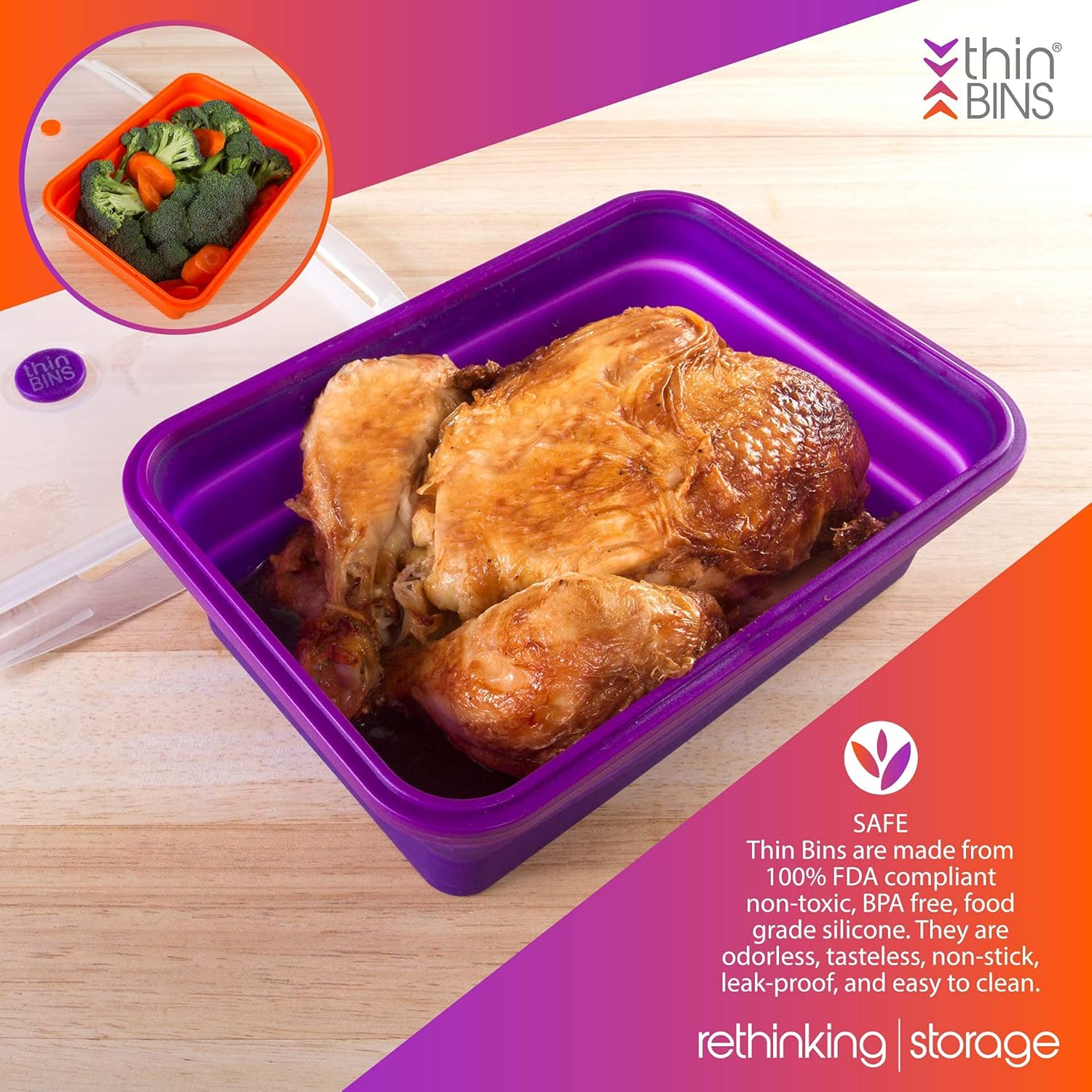 Kitchen Home Thin Bins Collapsible Containers – Set of 2 Extra Large Rectangle Silicone Food Storage Containers – BPA Free, Microwave, Dishwasher and Freezer Safe