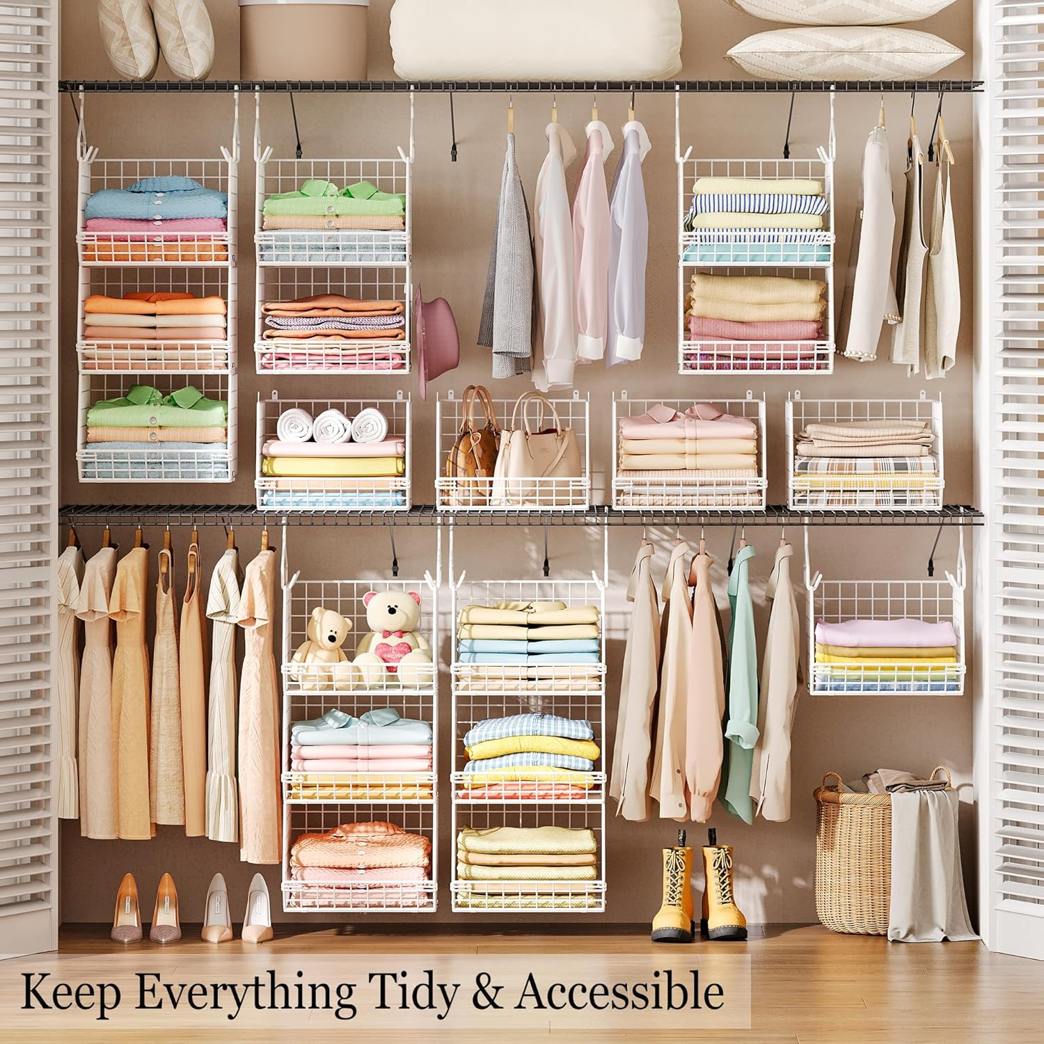 - Perfect Storage Organization: 3 tier wide open wire basket allows you to easily view, put in and take off more easily. X-cosrack metal basket hanging shelves provide a great storage solution for any room in the home. Maximize vertical space for storing clothes or toys, handbags, socks, gloves, hats, and more.