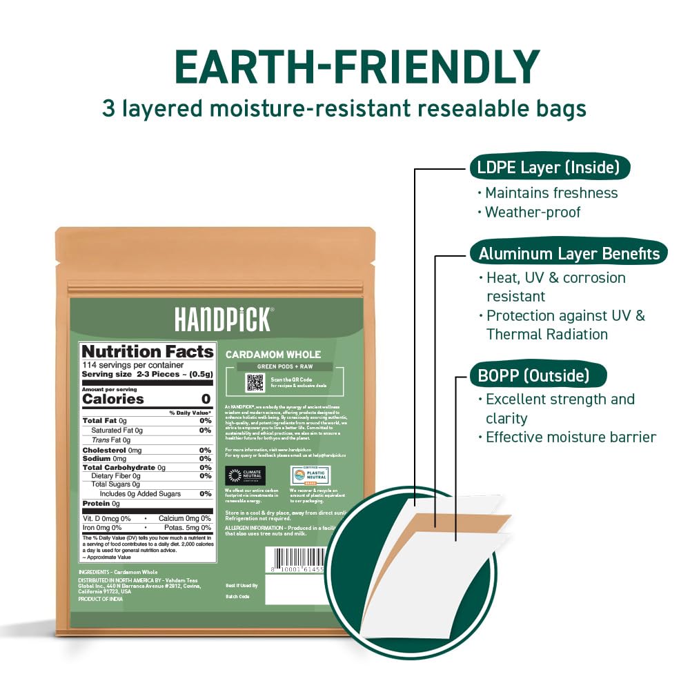 HANDPICK Green Cardamom Pods (57g / 2oz) Large size Green Elaichi | Pure, Non-GMO, Gluten Free | 100% Raw from India | Resealable Zip Lock Pouch