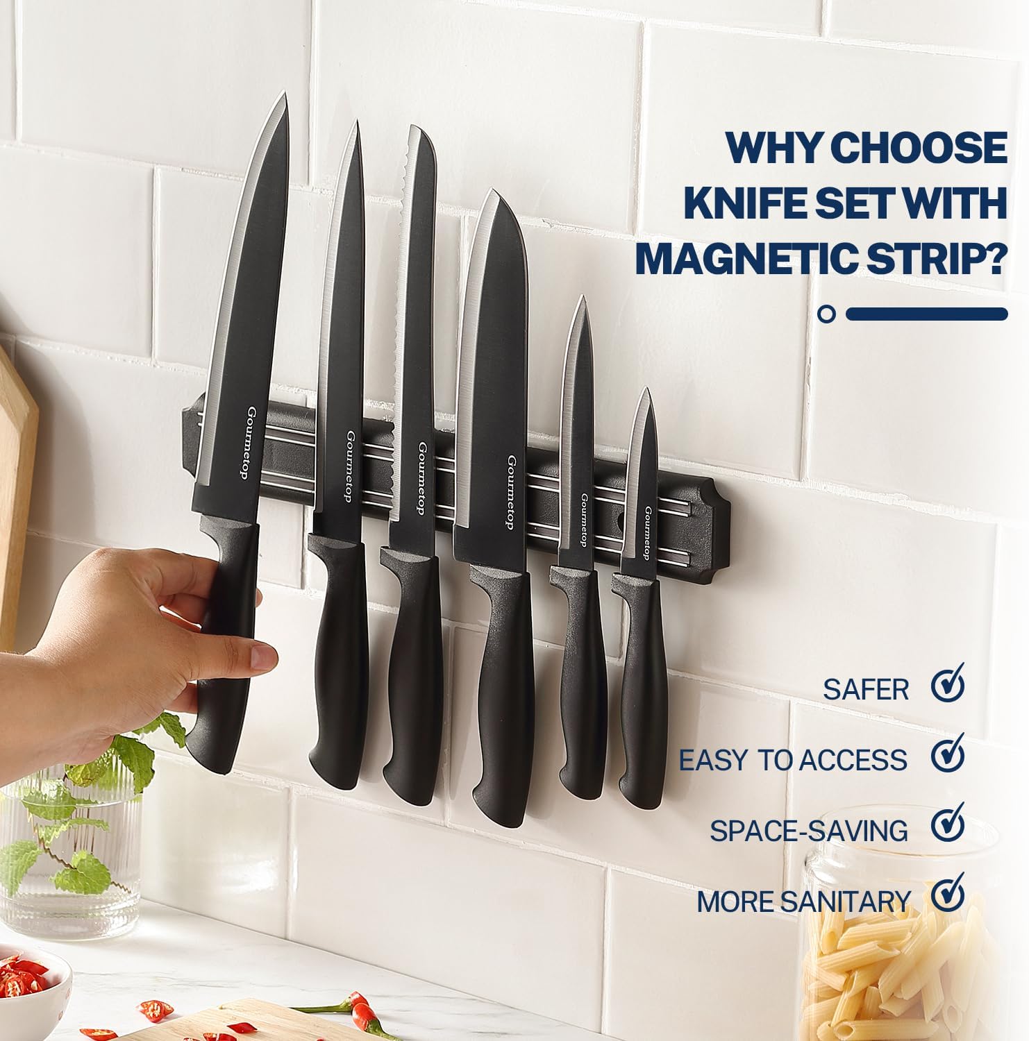 - 【BLACK BLADE & COMFORT HANDLE】The natural black coating on the stainless steel blades enhances the non-stick properties and improves the robustness and corrosion resistance. Unlike other solid PP plastic knife handles, the Gourmetop kitchen knife handles are added with a soft touch latex material, providing a comfortable, anti-slip grip.