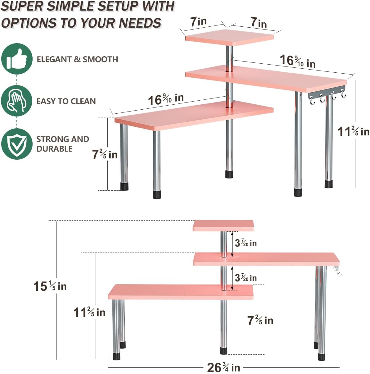 - STYLISH DESIGN: The pink bathroom countertop organizer is designed to fit into corners and make better use of every inch of valuable counter space; the adjustable position of each tier and freestanding design makes it easy to move where more storage is needed
