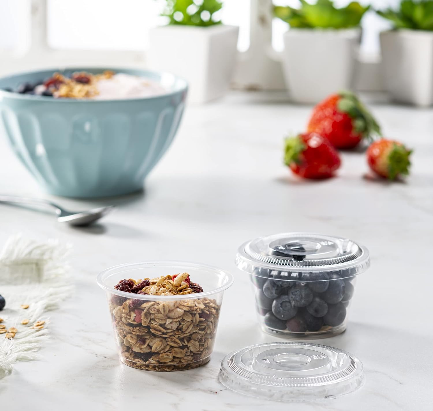 - {4 oz - 100 Sets} Clear Diposable Plastic Portion Cups With Lids, Small Mini Containers For Portion Controll, Jello Shots, Meal Prep, Sauce Cups, Slime, Condiments, Medicine, Dressings, Crafts, Disposable Souffle Cups & Much more