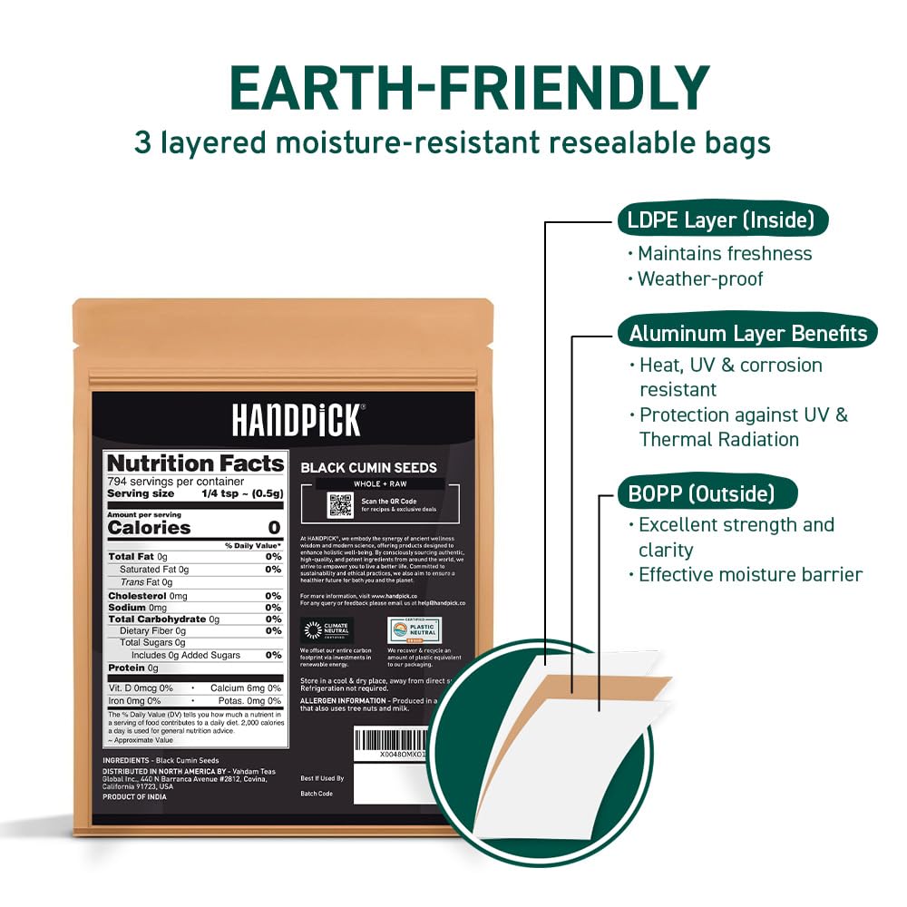 HANDPICK Black Cumin Seed (14oz) Pure Nigella Seeds - No Salt or Preservatives, Non GMO | Indian Black Whole Cumin | Gluten Free, Aromatic & Farm Fresh Kalonji | Resealable Zip Lock Pouch