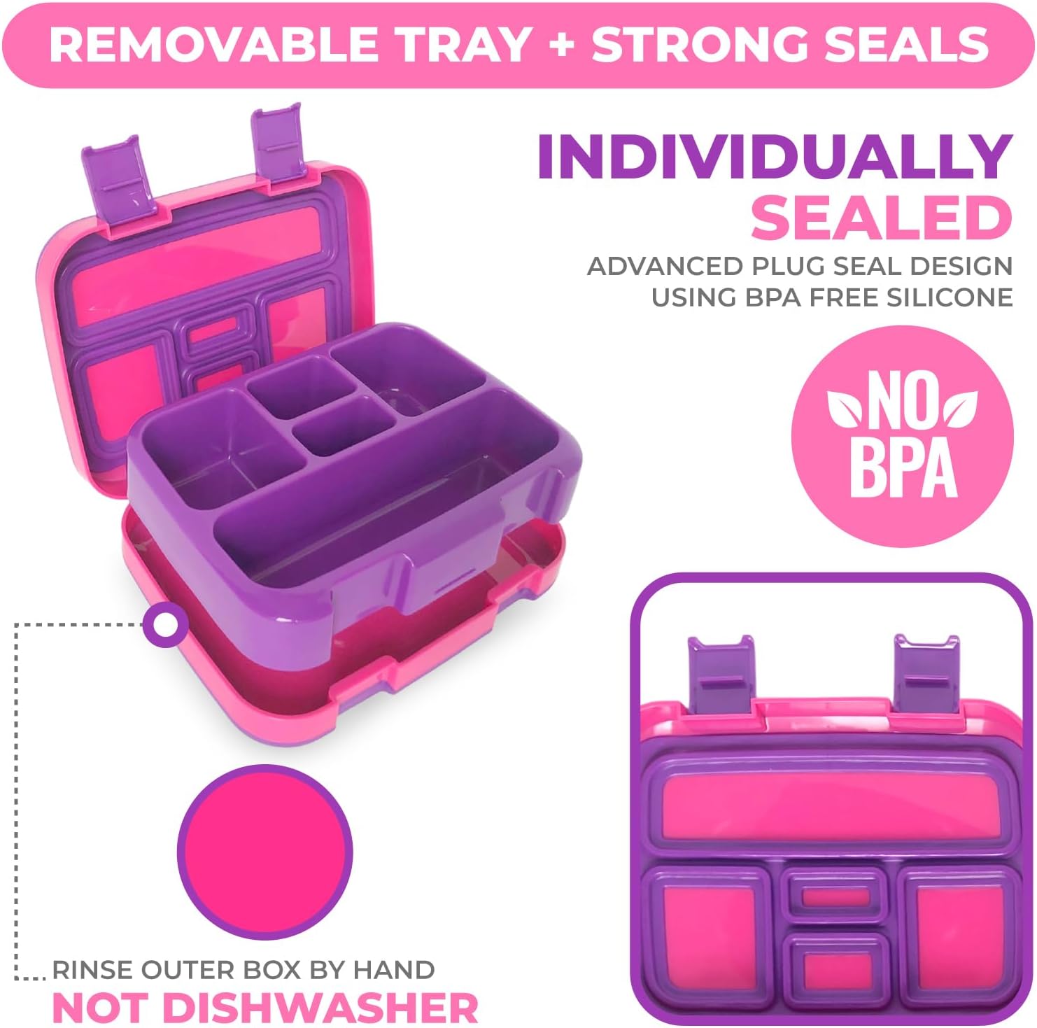 • DURABLE Leak Resistant Container – Along with a secure design, drop-resistant rubberized trim and easy-open latches for small hands these bento boxes for kids lunches feature a removable inner tray that’s microwave and dishwasher safe for versatile food prep and quick cleanup. BPA and phlalate free. WASH OUTER BOX BY HAND to maintain seal shape.