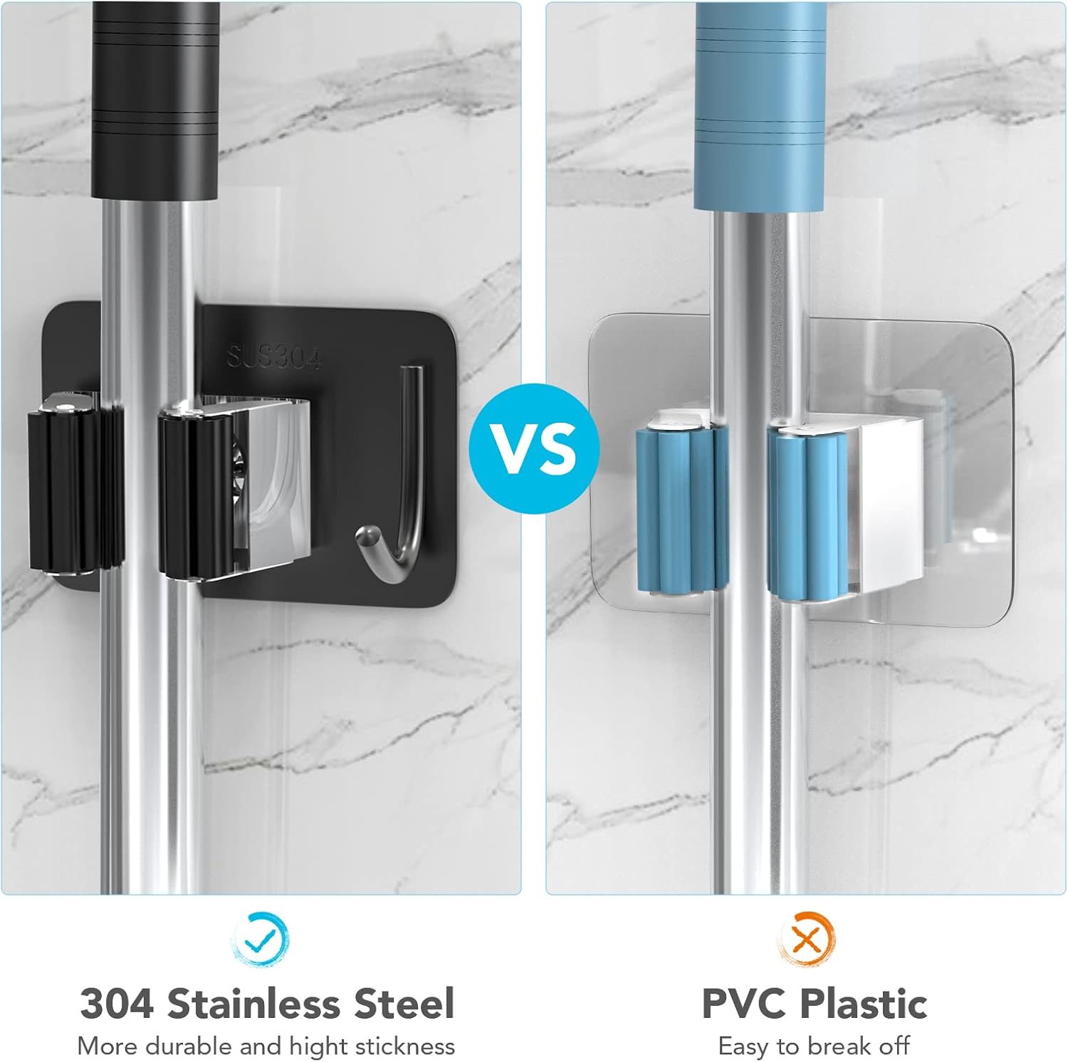 - ✔ Waterproof: HOMEASY self-adhesive broom holder wall mount is made of high quality SUS304 stainless steel, waterproof and rustproof. Triangle-buckle & petal-shaped gear adjust size automatically based on different thickness of the handles to prevent object slipping. Can stand up to 10 KG, more strong and sturdy than plastic holder