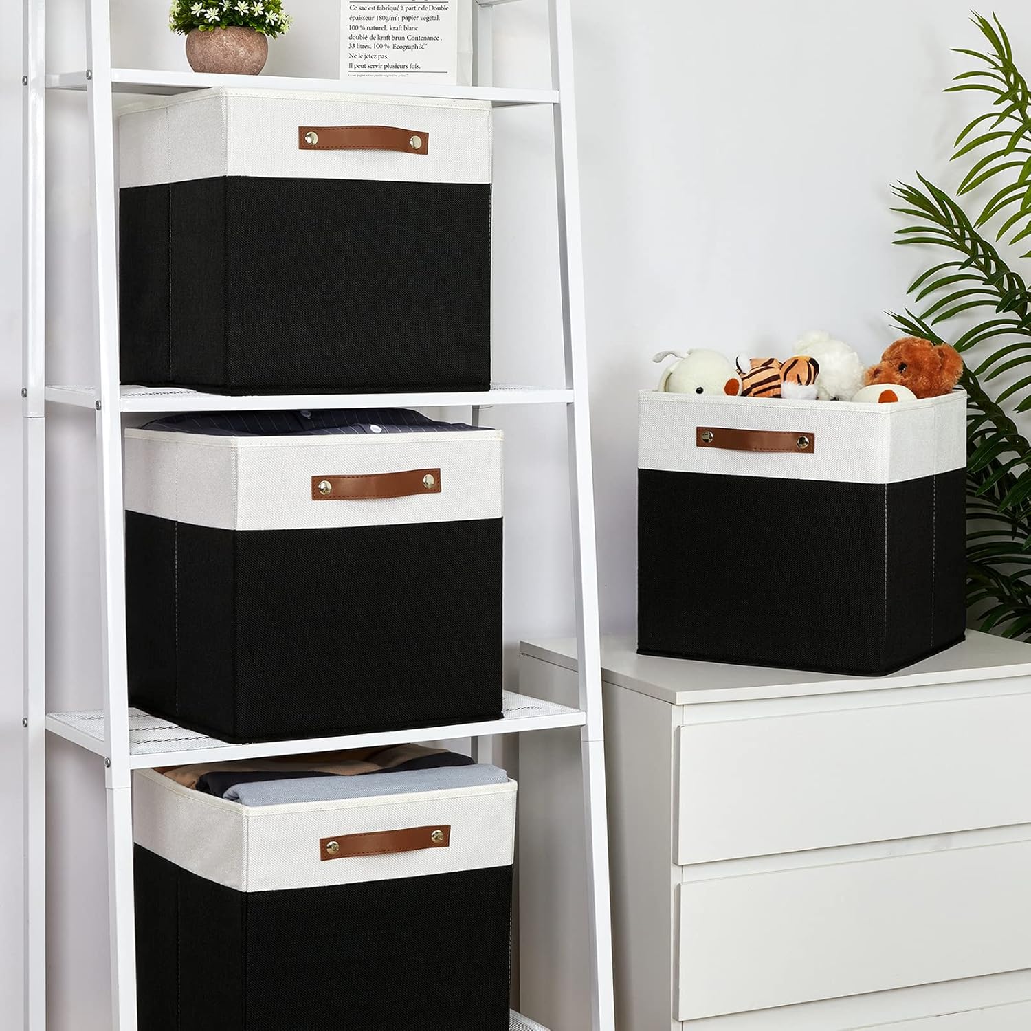 Temary Fabric Storage Bin 4 Pack Cube Storage Bin for Shelf Fabric Cube Storage Basket 13 Inch Cube Storage Bins Foldable Storage Cubes with Leather Handles(White&Black)