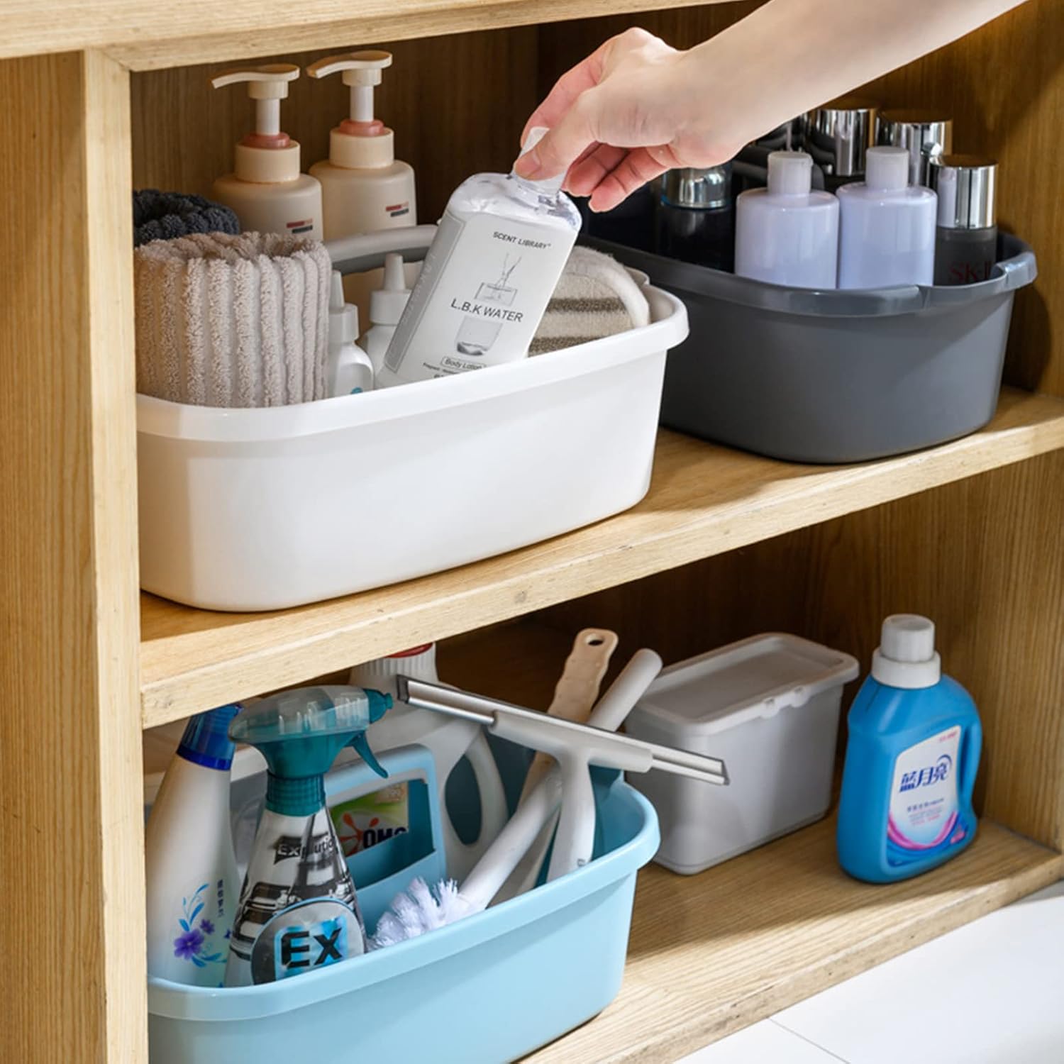 - Storage & Organization: The portable plastic storage basket is very suitable for storing cleaning supplies, spray bottles, brushes, cleaning cloths, paper towels, shower gel, shampoo, towels, cosmetics, hand soap, office supplies, etc.