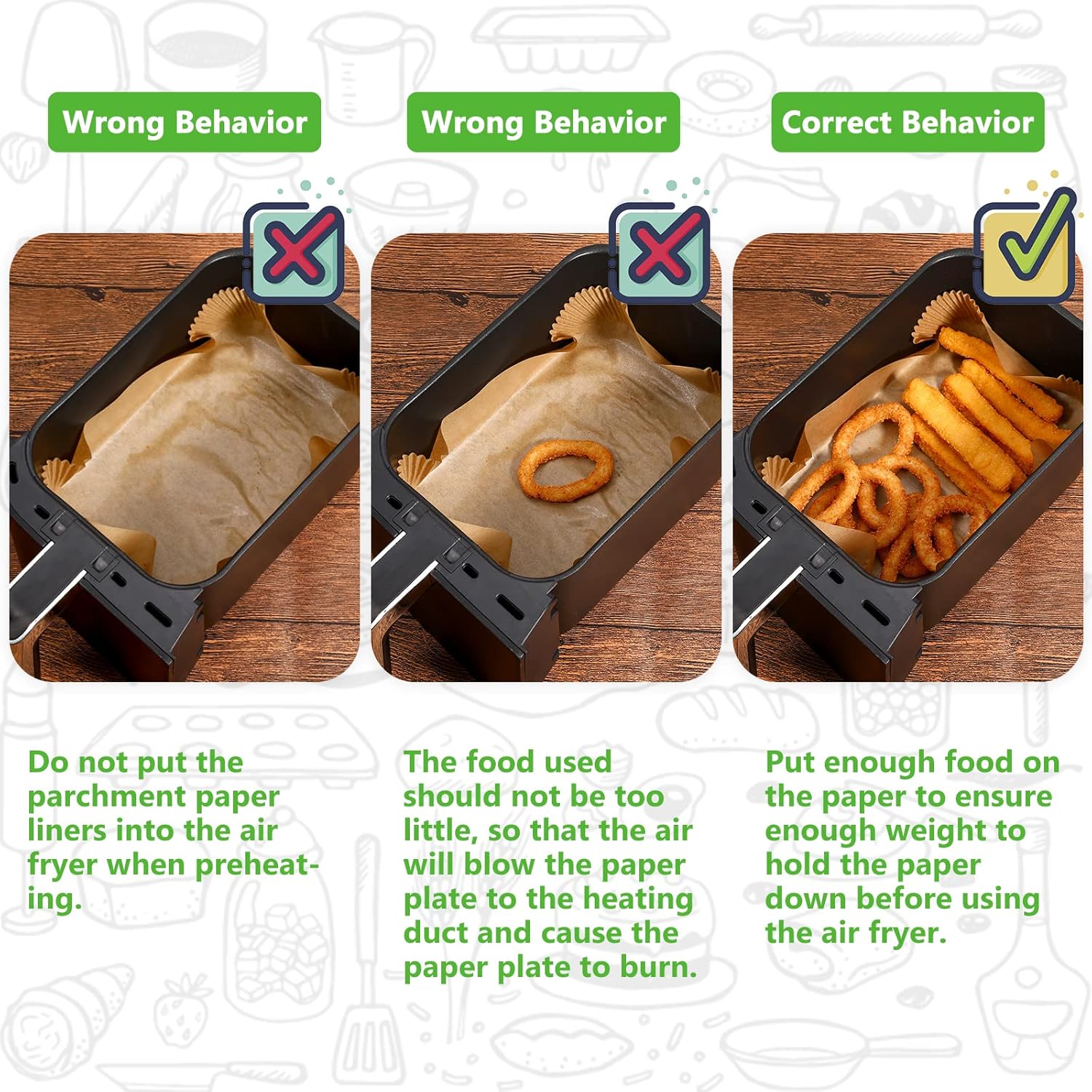 • ⚠️【Cautions】 Do not put empty parchment paper liners when preheating, and do not use too little food to avoid disposable paper liners that cannot be pressed because of their light weight, and hot air blowing the paper liners into the heat pipe causing the paper pan to burn.