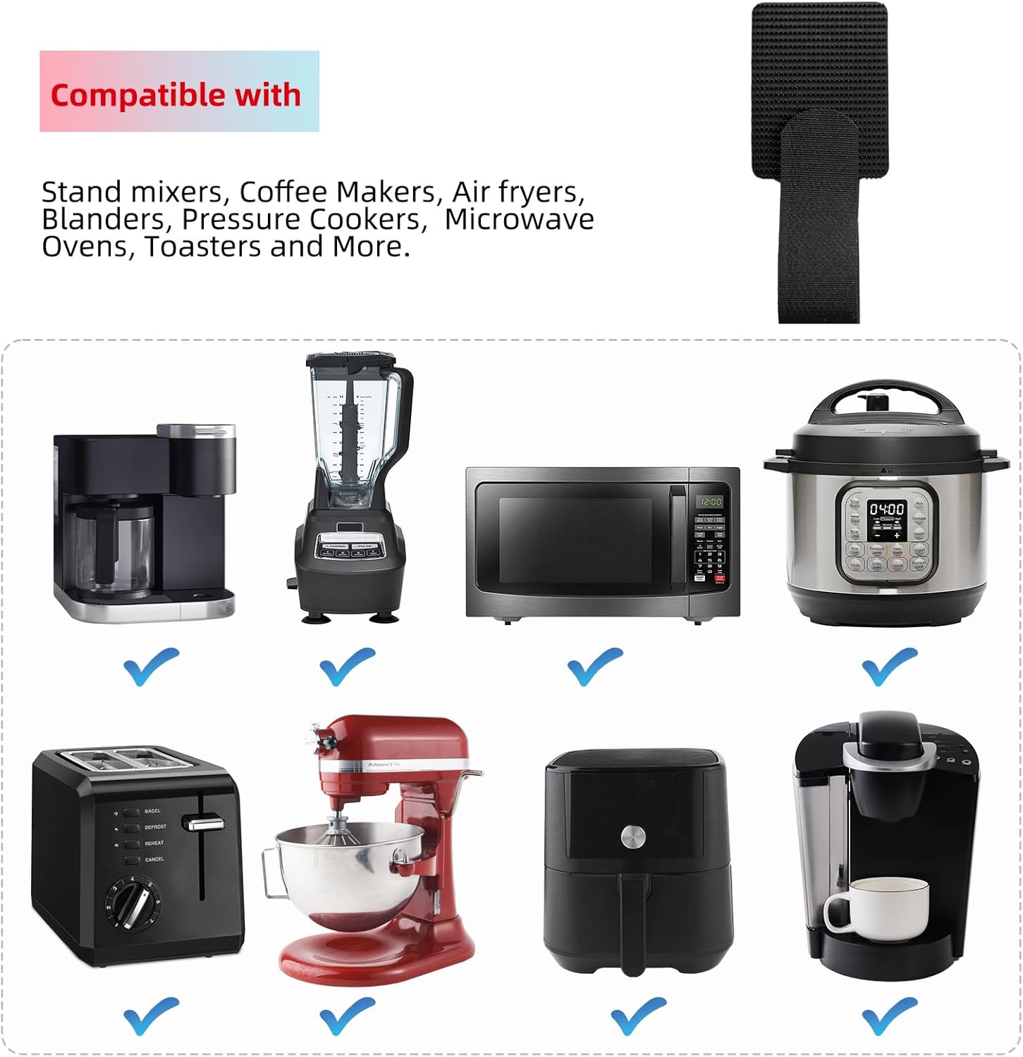 - Strong Applicability: The SUITMAT cord holder has no requirements for the thickness and length of the wires. Suitable for a variety of small appliances, such as kitchenAid mixer, air fryer, coffee machine, pressure cooker, microwave oven, blender, juicer, etc
