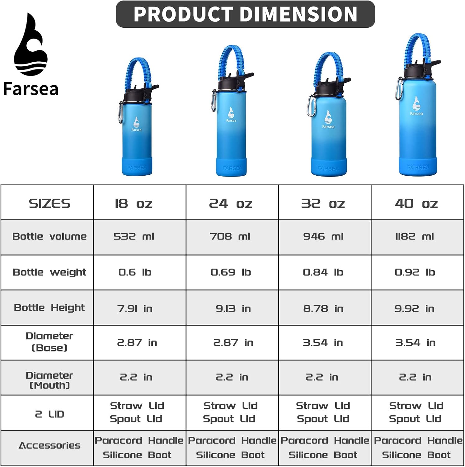 - WHAT YOU'LL GET: Farsea is committed to providing the best value and highest quality to the customers; We offer Continuous After-sales Service and Solve All Problems; We offer several different capacity bottles(12 oz, 18oz, 24 oz, 32 oz, 40oz) and you can choose according to your needs; Package: Comes with 2 lids (Straw lid & Spout Lid), paracord holder, protective Silicone Boot, nice packing box, 2 straws, and straw brush