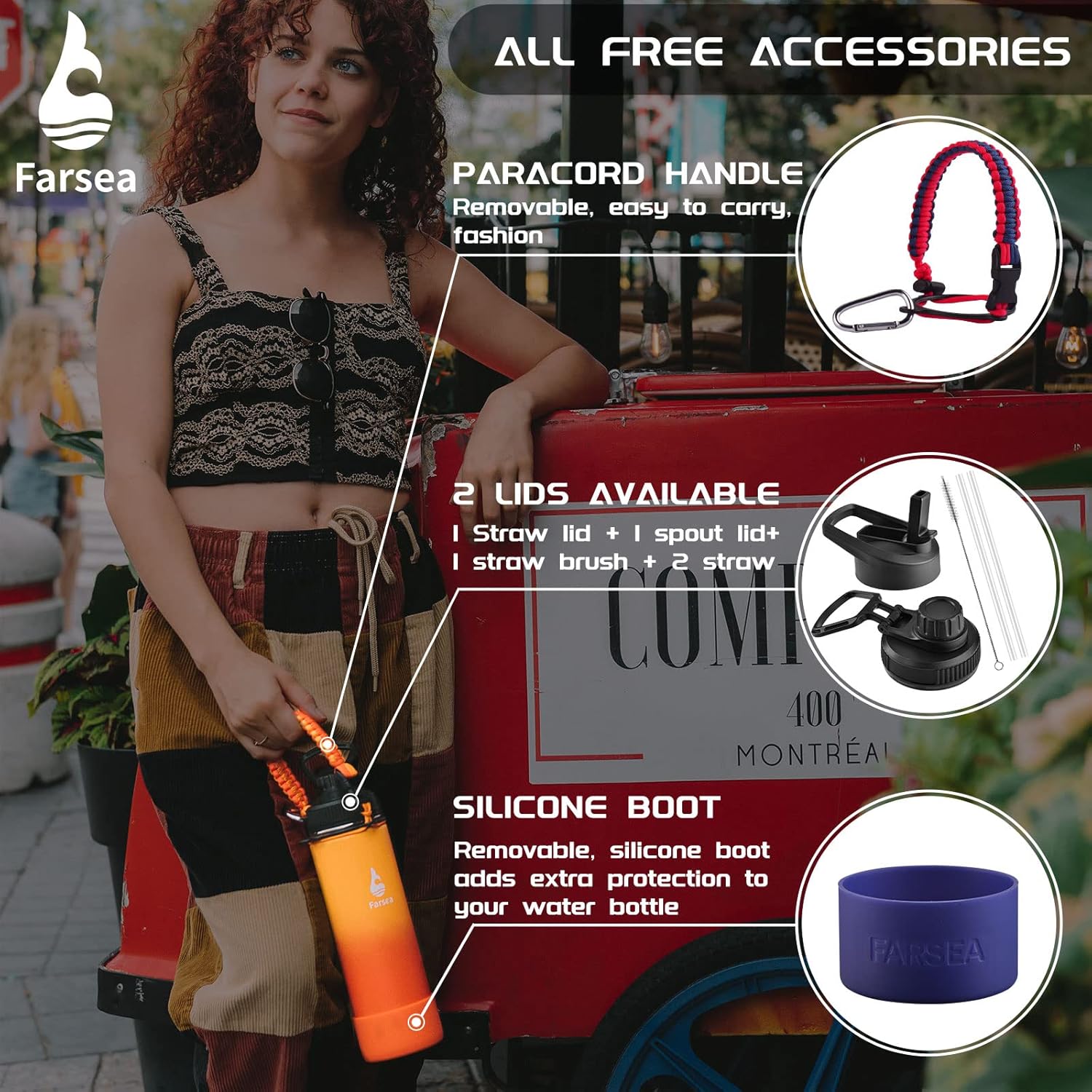 - WHAT YOU'LL GET: Farsea is committed to providing the best value and highest quality to the customers; We offer Continuous After-sales Service and Solve All Problems; We offer several different capacity bottles(12 oz, 18oz, 24 oz, 32 oz, 40oz) and you can choose according to your needs; Package: Comes with 2 lids (Straw lid & Spout Lid), paracord holder, protective Silicone Boot, nice packing box, 2 straws, and straw brush
